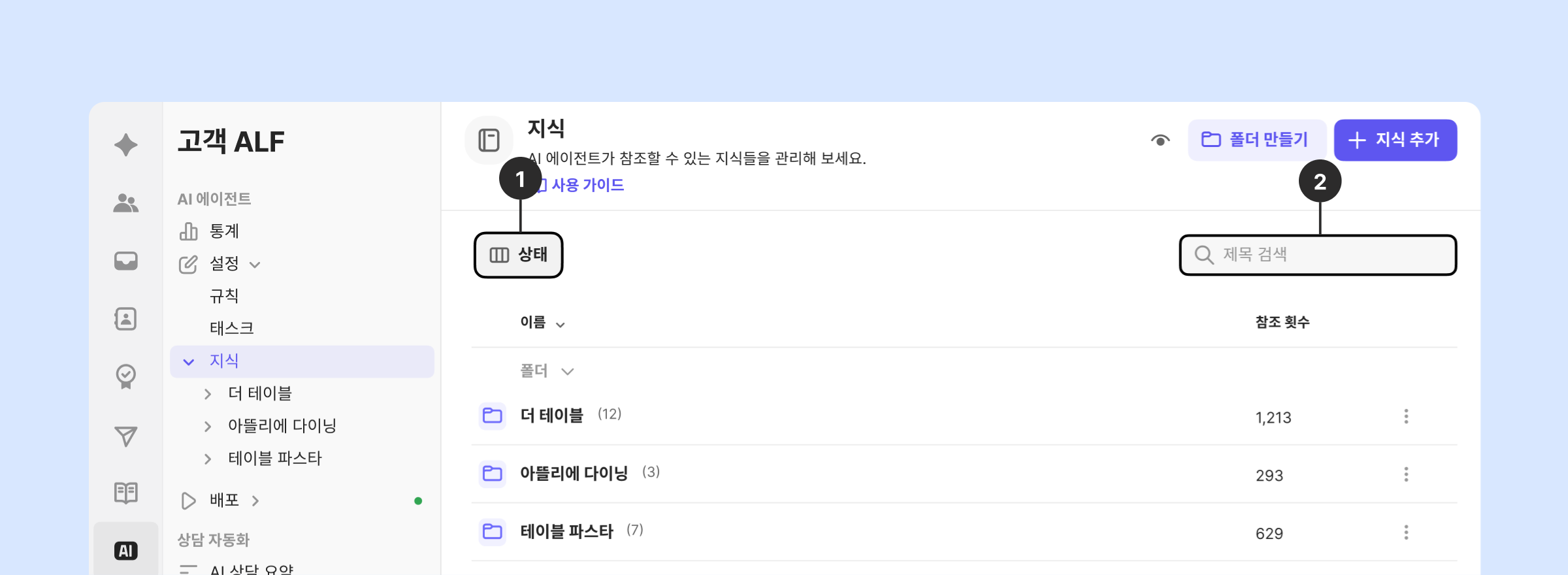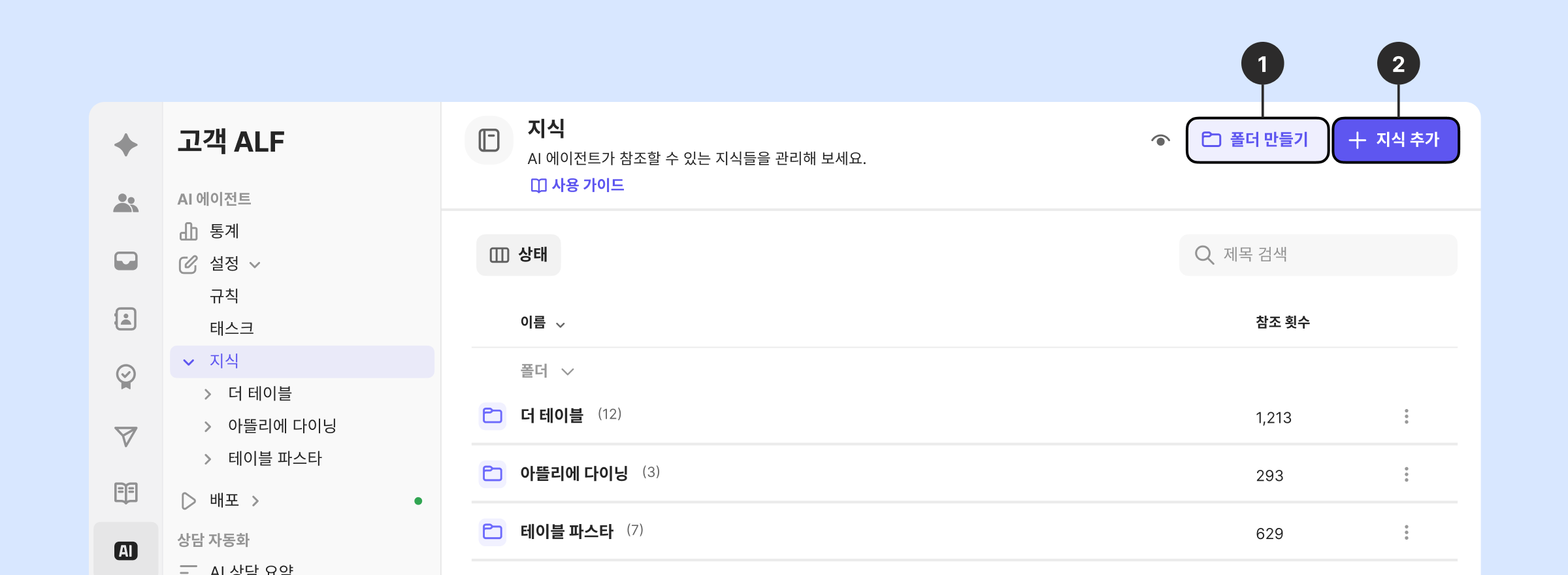 더 잘 활용할 수 있도록 지식의 구조를 소개해 드릴게요. 지식 센터는 폴더와 지식 항목으로 구성됩니다.