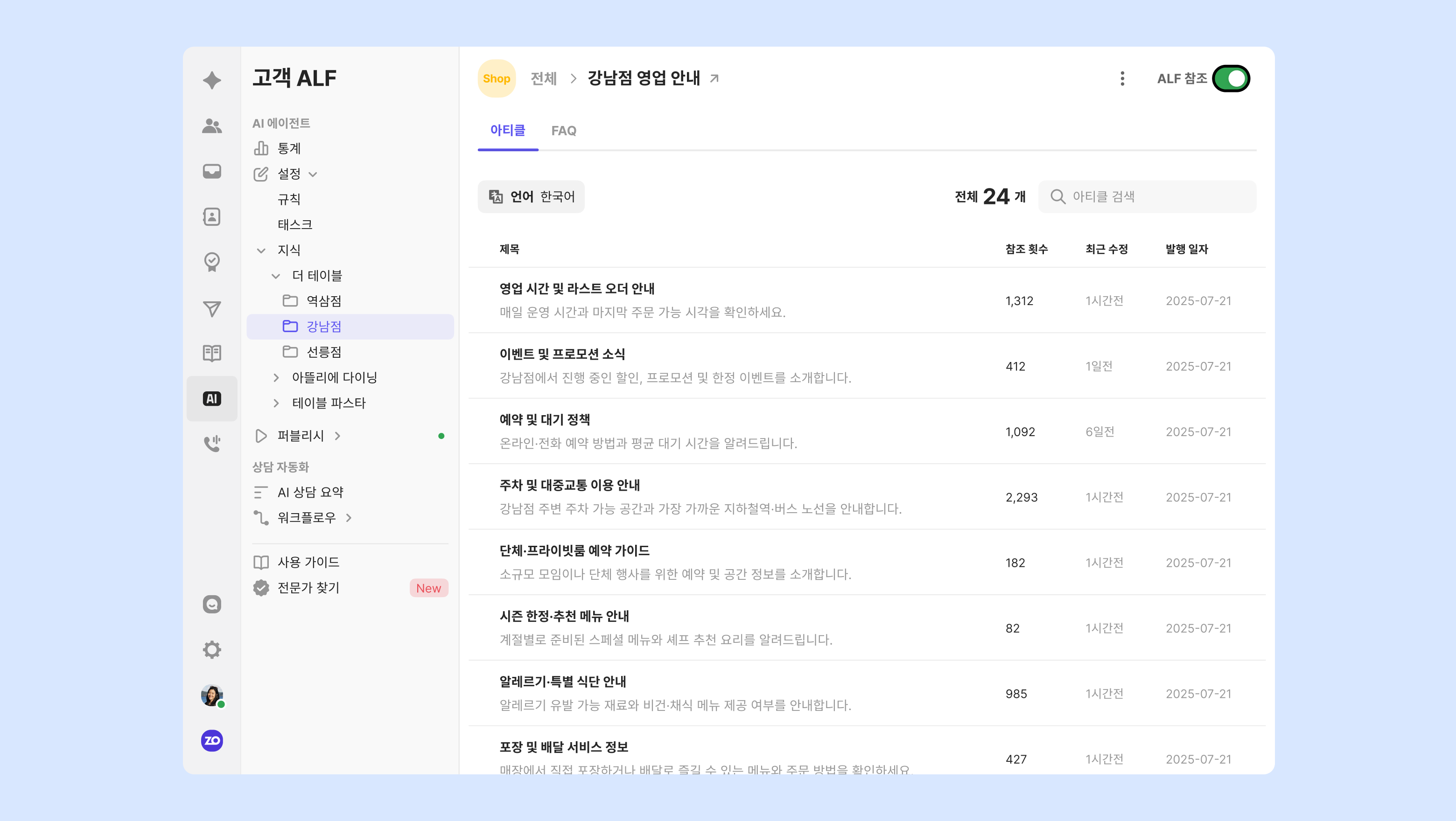 스페이스 안의 아티클 · FAQ는 공개(퍼블리시)된 것만 지식 센터에 올라가며, ALF도 이 공개된 내용을 참고해 답변을 생성합니다.