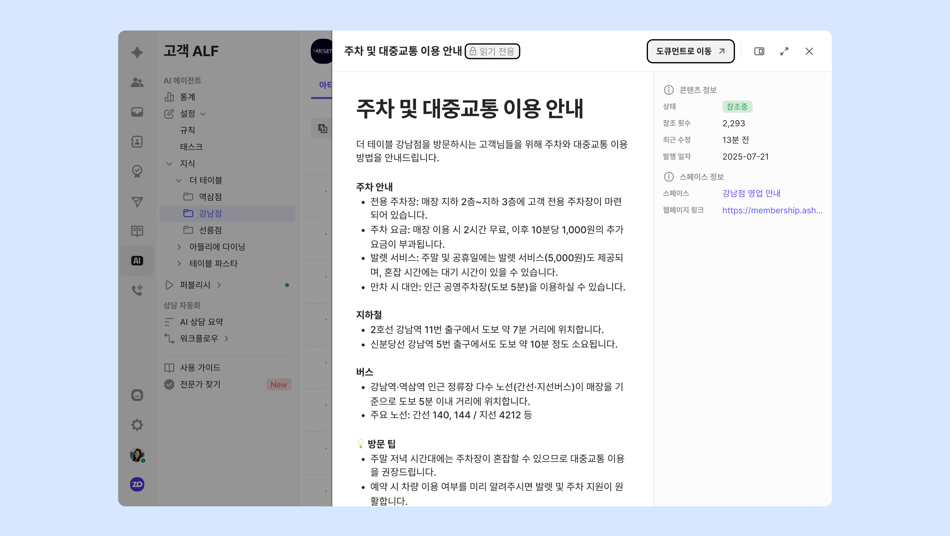 아티클 작성 · 수정은 도큐먼트 탭에서만 가능하고, 지식 센터에서는 등록된 아티클과 FAQ를 읽기 전용으로 확인할 수 있습니다.