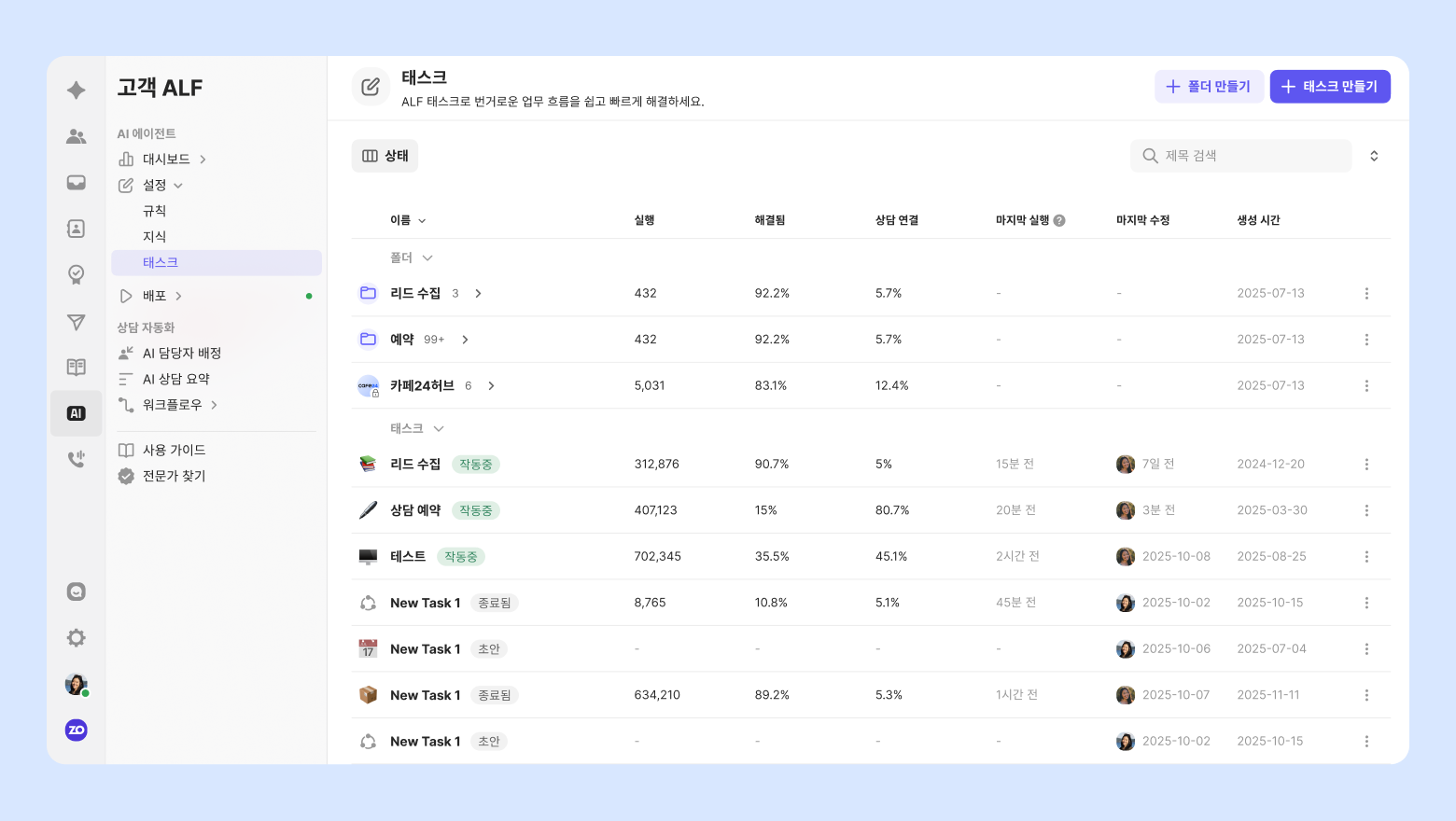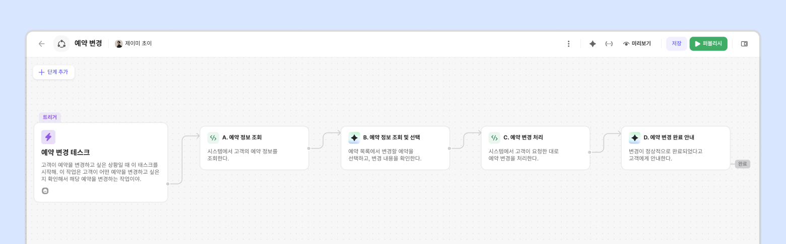 태스크(Task)는 고객이 자주 요청하는 특정 업무를 자동화된 흐름으로 처리할 수 있도록 만든 기능입니다. 이제는 태스크를 통해 단순 질의응답을 넘어 대화형으로 실제 업무 처리까지 가능합니다.