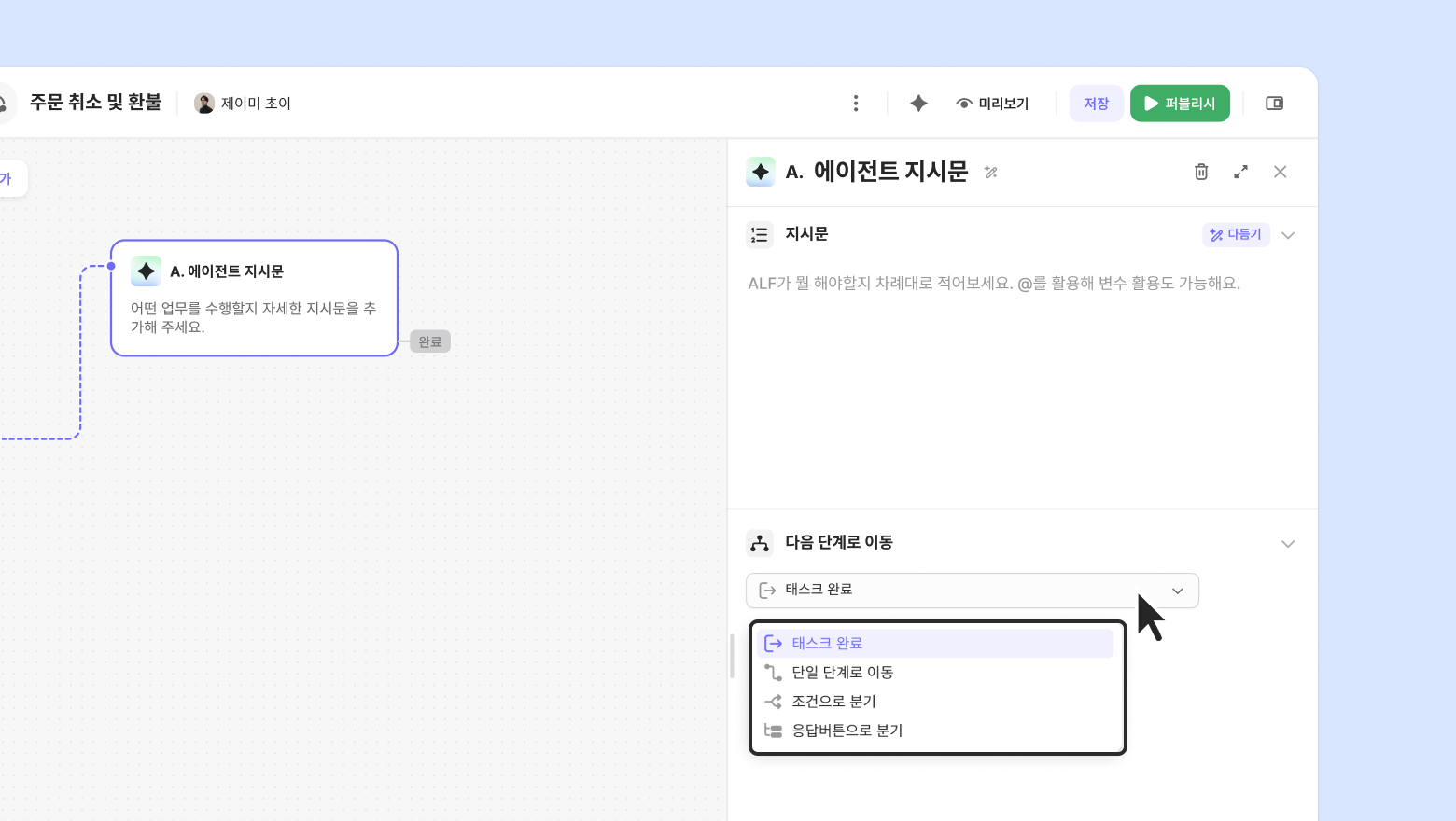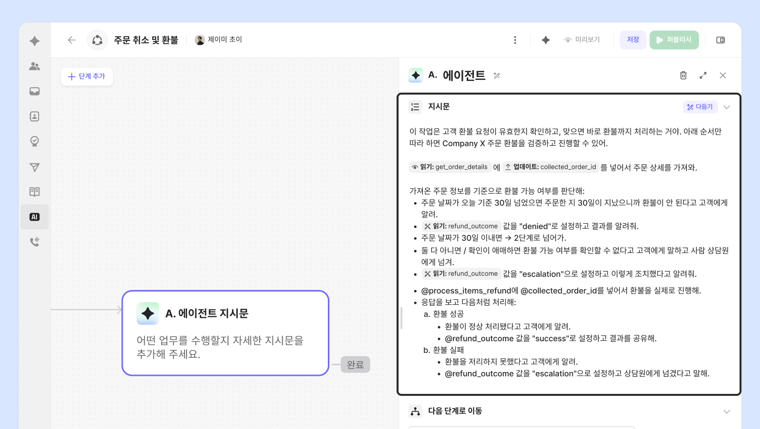 에이전트 단계는 모든 지시문 수행 후 고객의 답변이 있어야 다음 단계로 이동합니다.