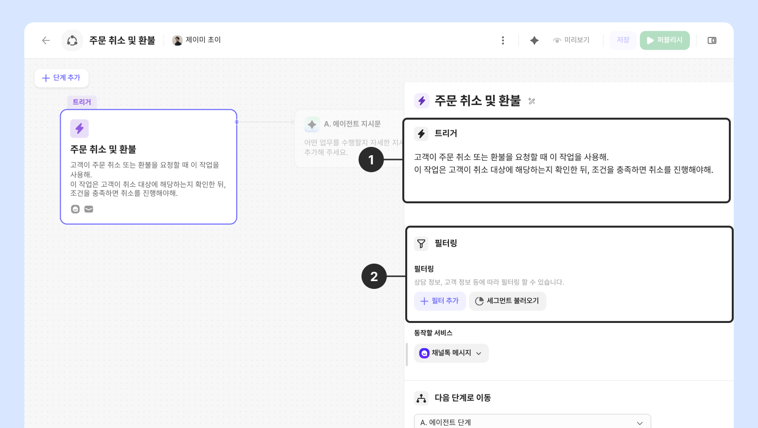 예시) “환불 요청”이라는 트리거 문구 + VIP 고객 필터를 동시에 걸면, VIP 고객이 환불을 요청했을 때만 태스크가 실행됩니다.