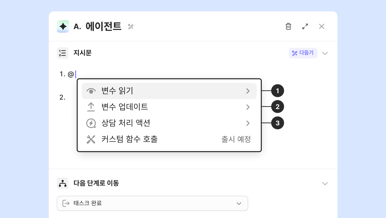 지시문 작성 중 @를 입력하여 다양한 변수를 활용하거나 상담 처리 액션을 사용할 수 있습니다.