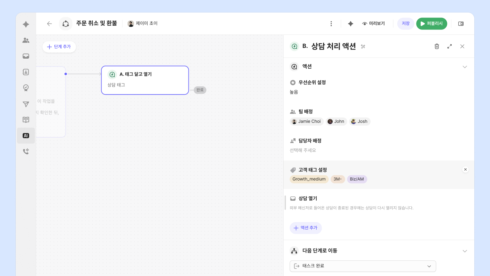3) 상담 액션 실행: 상담 열기, 팀 배정, 담당자 배정, 팔로워 배정, 상담 태그 설정 등 간단한 액션을 자동 처리