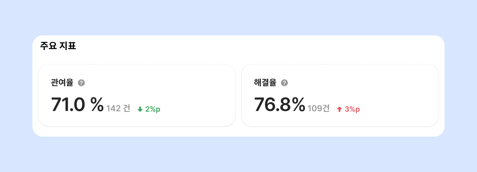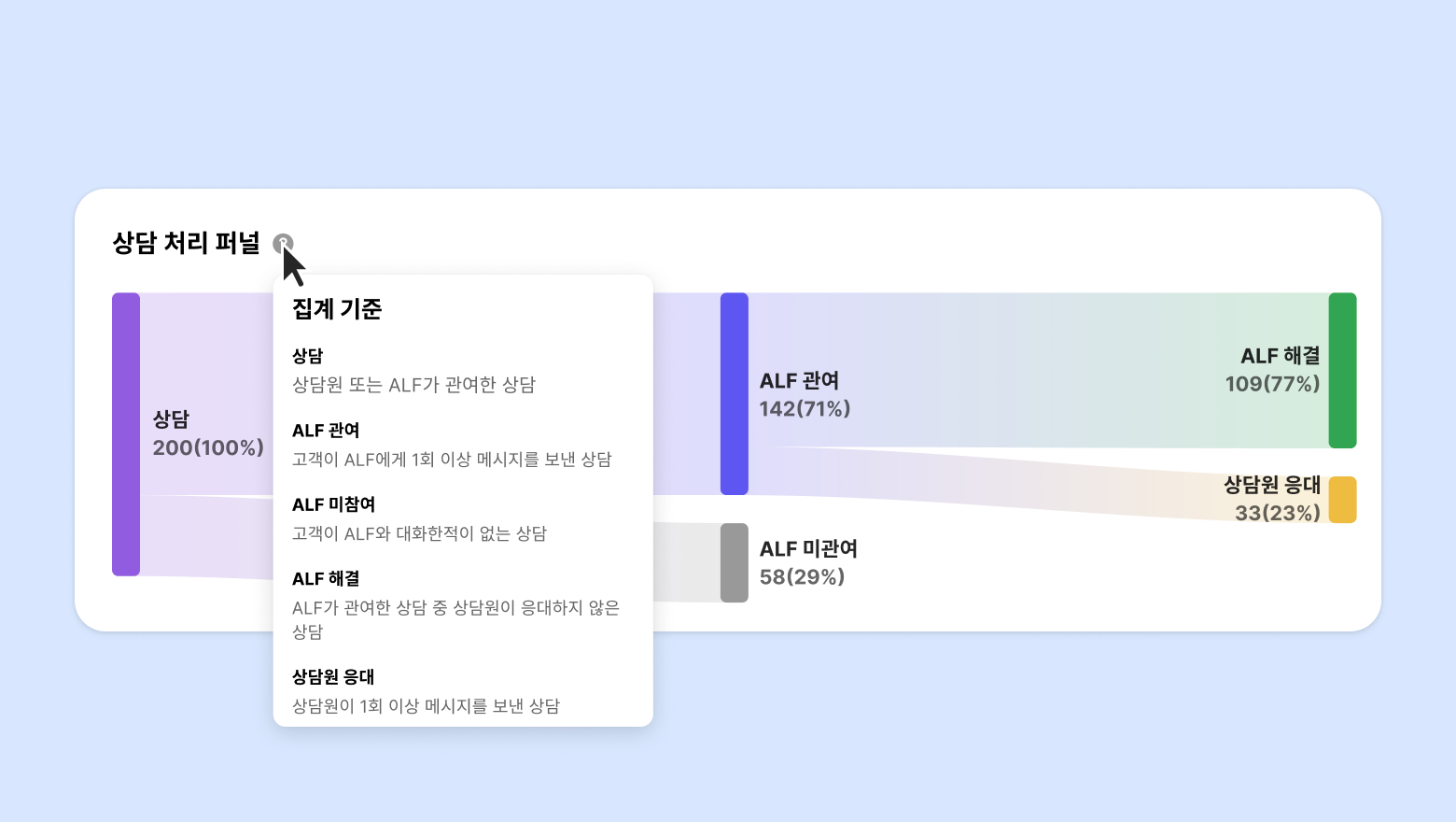 상담 처리 퍼널은 전체 상담 중 ALF가 얼마나 관여했는지, 그리고 실제로 해결까지 이어졌는지를 단계별로 보여주는 통계입니다. 상담 흐름을 시각적으로 확인할 수 있어, AI 상담 자동화 성과를 쉽게 파악할 수 있습니다.