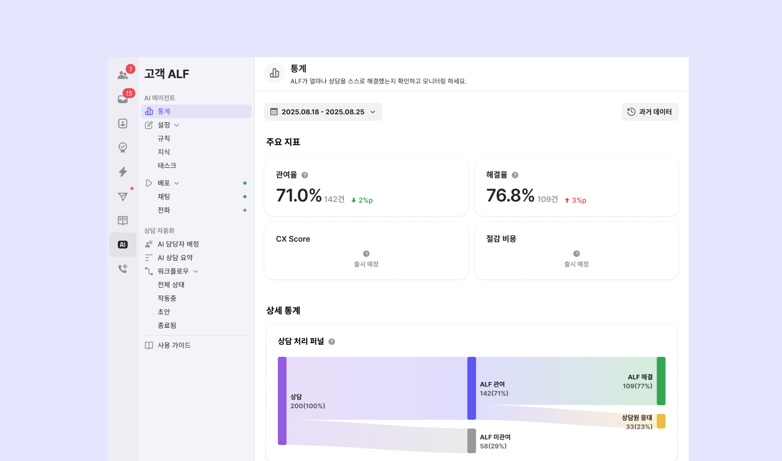 상담 참여 비율, 고객 질문에 대한 유의미한 답변 해결률, CX 스코어, 그리고 ALF를 통해 절감된 비용 추산까지 한눈에 확인할 수 있는 통계 기능을 제공합니다.