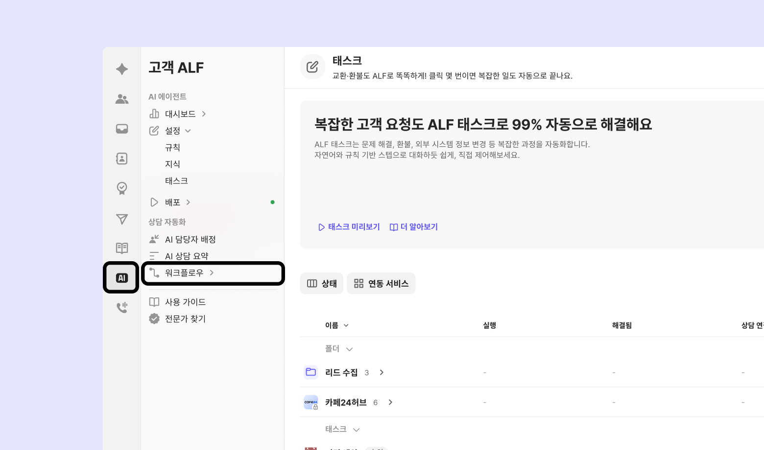 워크플로우 메뉴가 고객 ALF 하위로 이동합니다. 이제 ‘자동화’를 위한 기능은 모두 AI 탭 한 곳에서 관리할 수 있습니다.