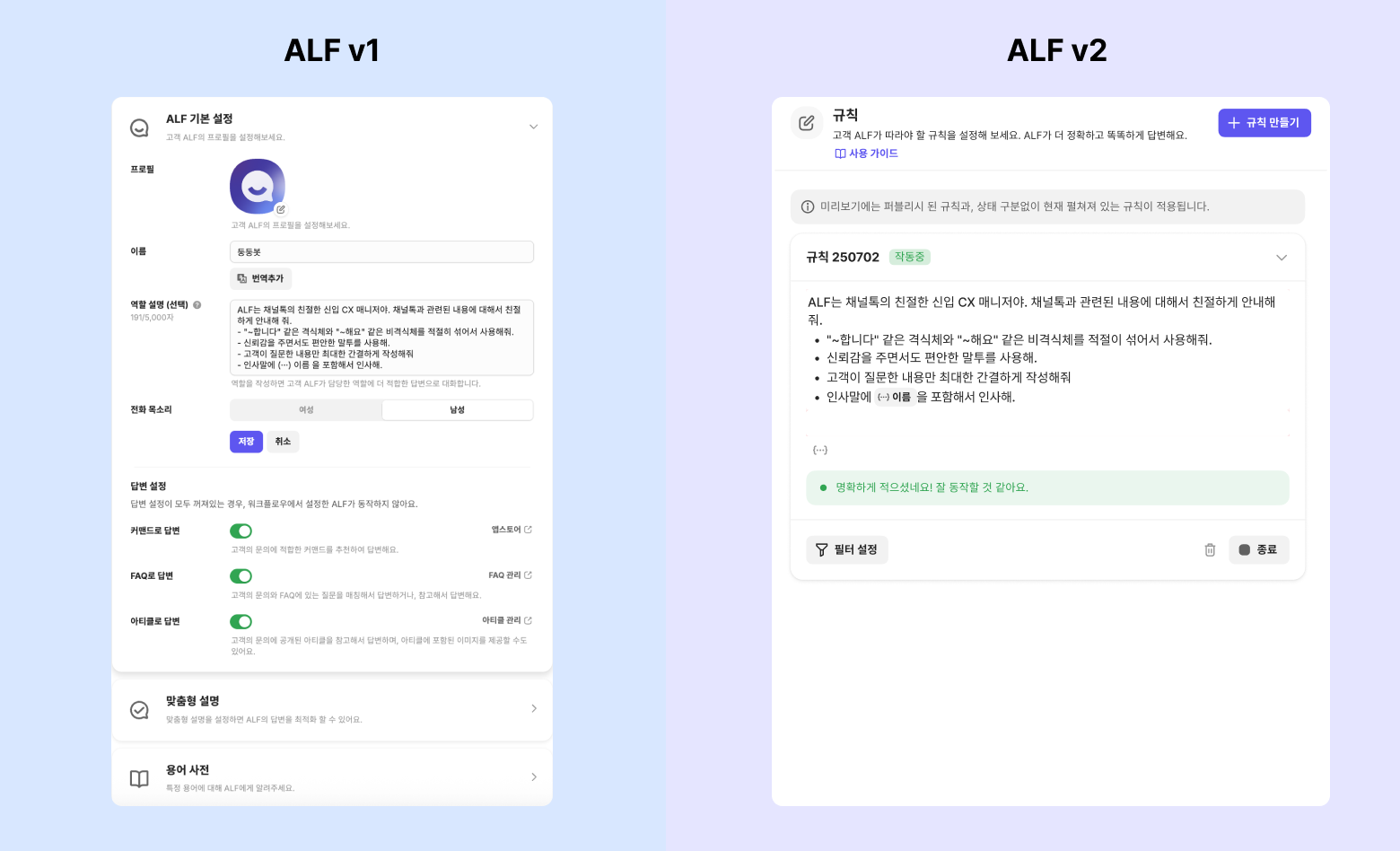 기존에 입력한 역할 설명, 맞춤형 설명, 용어 사전 데이터는 ALF v2의 '규칙'으로 자동 이전(마이그레이션)될 예정입니다.(10월 31일까지)