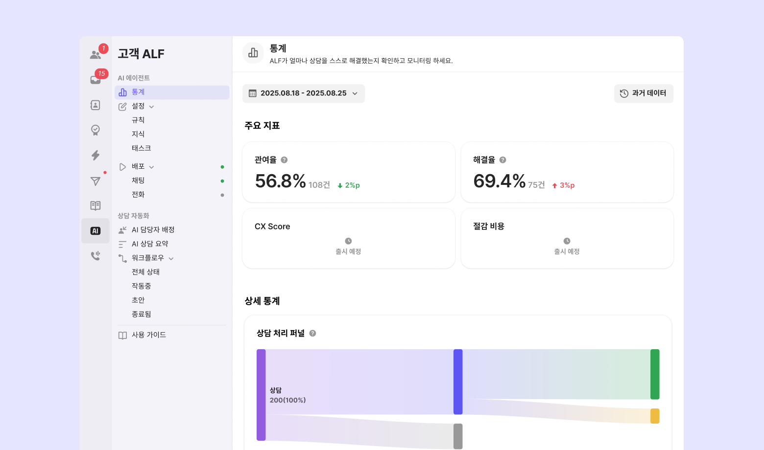 관여율, 해결률 퍼널 그래프를 통해 ALF가 상담에 얼마나 개입했고, 얼마나 해결했는지를 시각적으로 확인할 수 있습니다.