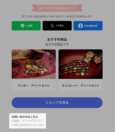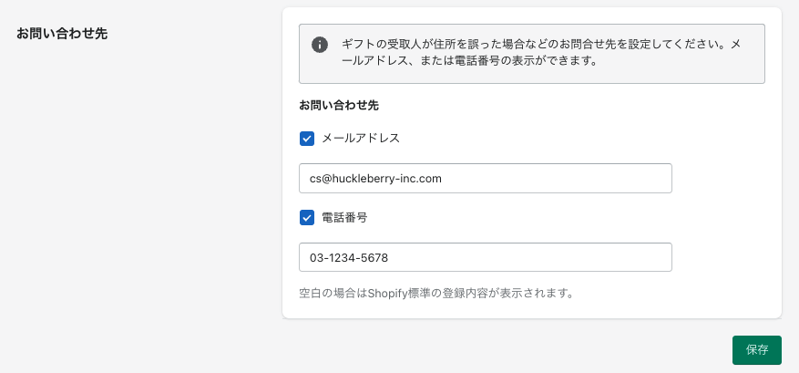 概要eギフトの受け取りページにお問い合わせ先を表示させる機能です。受取者が登録エラー等で、店舗へ連絡する際の問い合わせ先を登録してください。受け取り情報を入力後のサンクスページの最下部に、設定した問い合わせ先情報が表示されます。設定方法アプリ > All in gift > 設定 > お問い合わせ先表示させたいお問い合わせ先にチェックをいれるメールアドレス・電話番号(または両方)を入力保存 をクリックして完了です