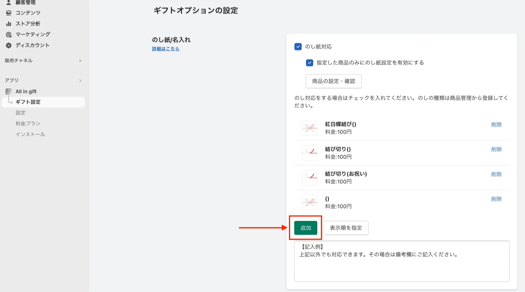 概要 --- ギフトオプションとは、ギフトに関連するオプション(のし紙・ラッピング・メッセージカード・手提げ袋)を設定できる機能です。 以下の手順でご登録をお願いします。 設定の流れ --- STEP1:ギフトオプションを商品として登録:Shopify管理画面 - のし紙やラッピング等のギフトオプションをShopifyの商品として登録します STEP2:アプリ管理画面で表示設定:All in gift管理画面 - All in gift アプリ管理画面にて登録したギフトオプションを、アプリウィジェットに表示させる設定をします 設定方法 --- STEP1. ギフトオプションを商品として登録 1. 商品を作成 - Shopify管理画面 > 商品管理 > 商品を追加を選択する(新規商品を作成する) - ギフトオプション(のし紙やラッピングなど)を新規商品として登録する 2. 商品情報を設定する - タイトル:購入時に表示される商品名を入力 - メディア:ギフトオプションの画像を登録 ※未登録の場合は「NO IMAGE」と表示されます - 価格:任意の価格を設定(無料の場合は「¥0」) -
