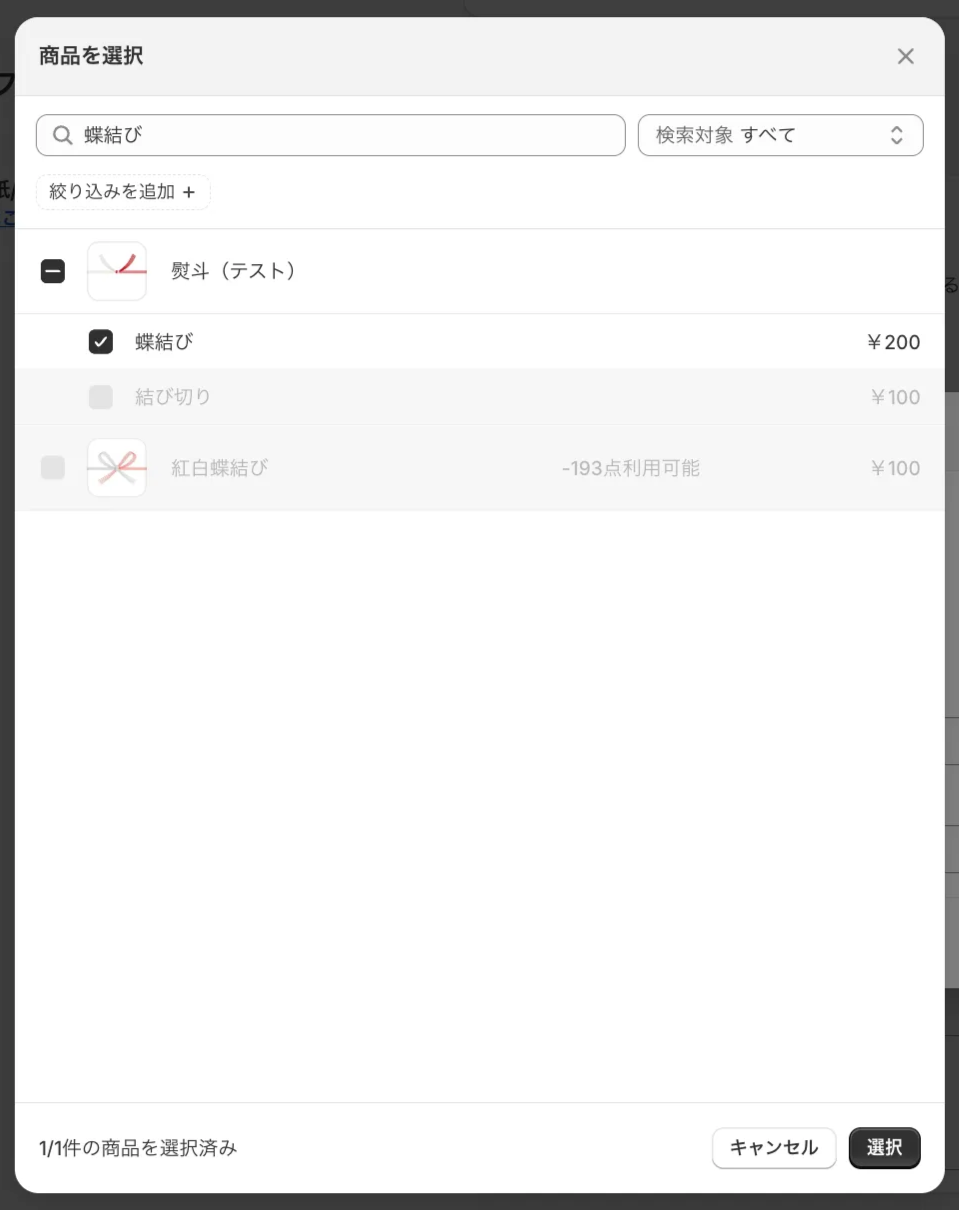 例:全商品(または指定した商品)に、「のし紙A、のし紙B」を設定する