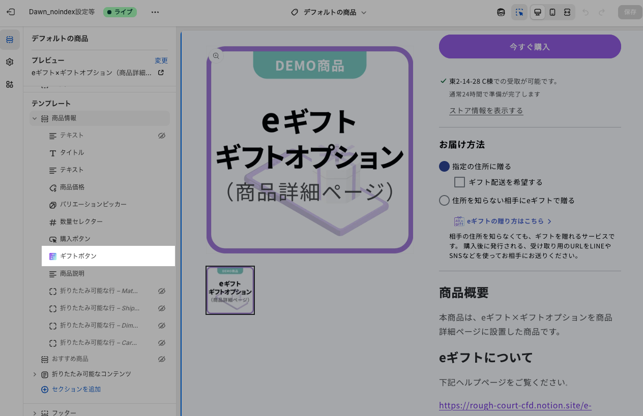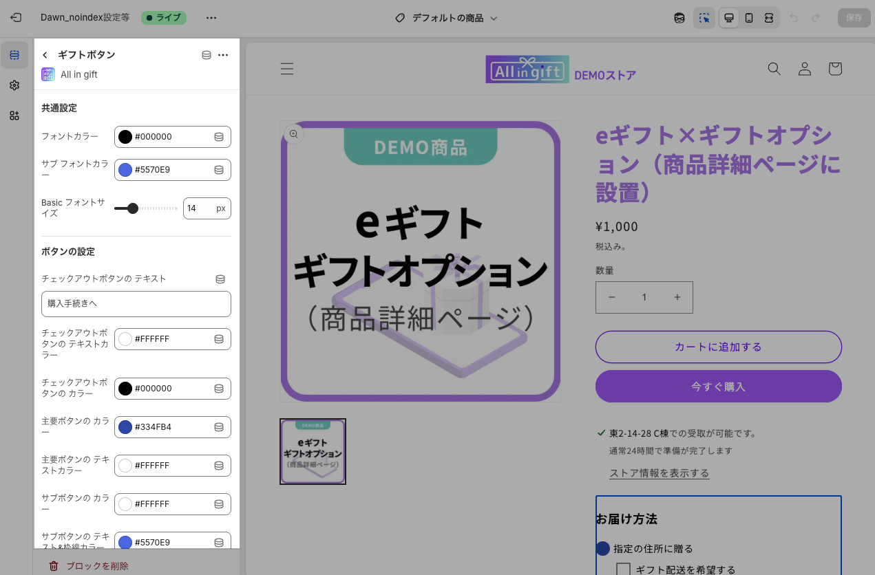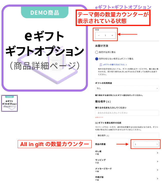 ギフトを選択した際、テーマ側のカートボタンや数量カウンターなどが表示される場合があります。これらの要素は 注文に反映されない仕様です。必ず非表示設定 を行ってください。