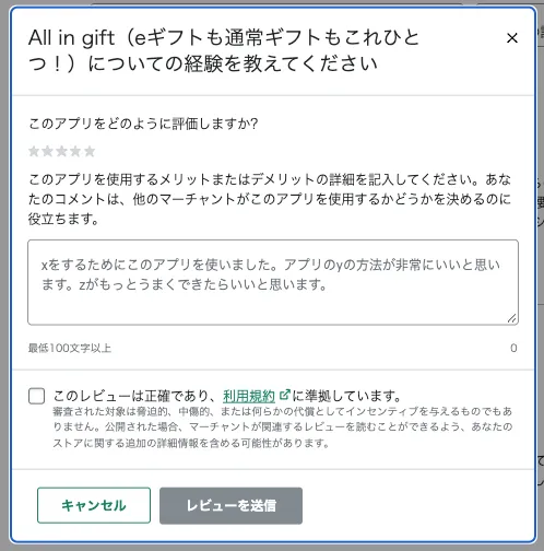 以下の手順で、All in gift アプリにレビューを投稿していただけます。