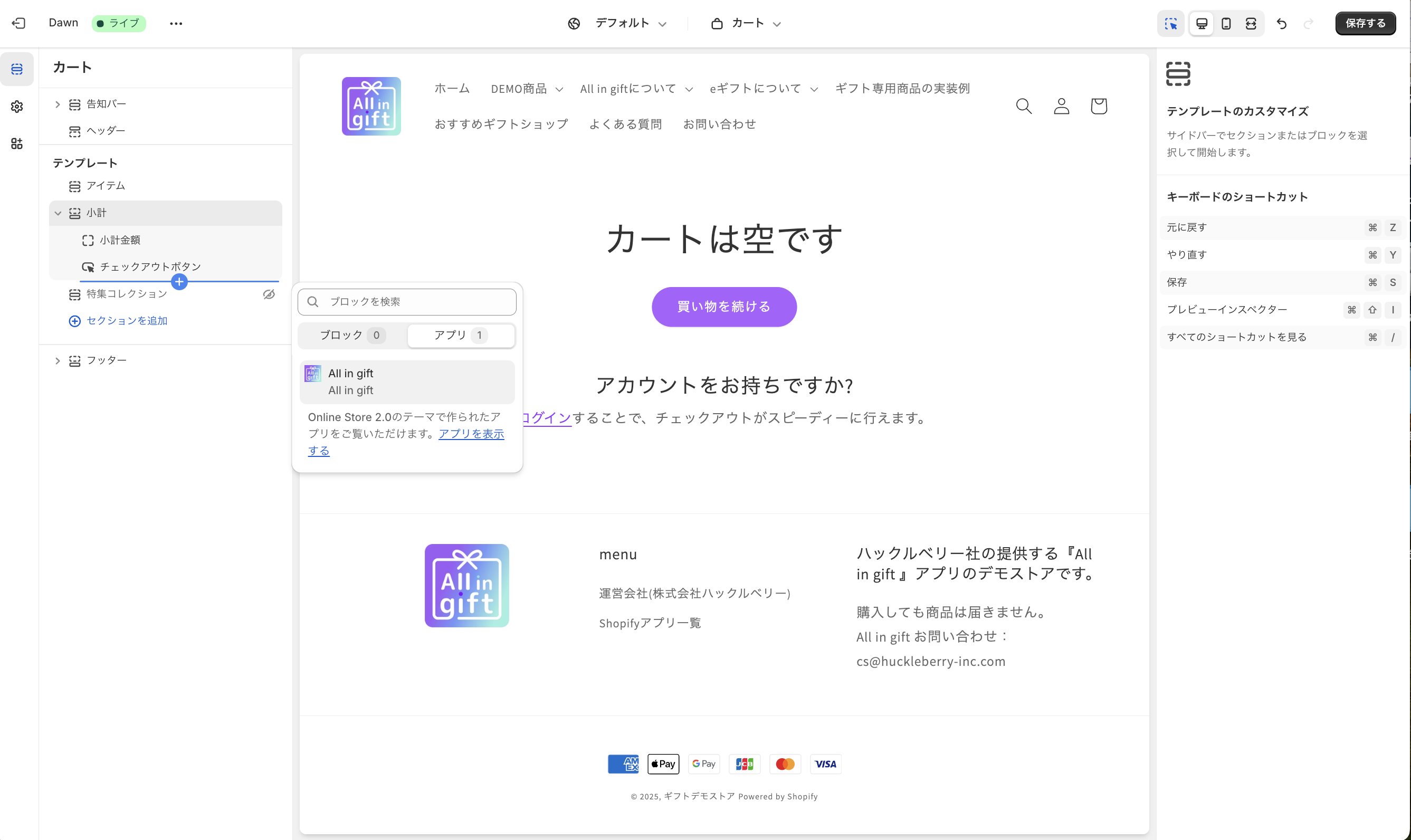 OS2.0テーマをご利用の場合、All in giftのウィジェットは自動的にインストールされます。テーマエディタから簡単に表示設定を行うことができます。