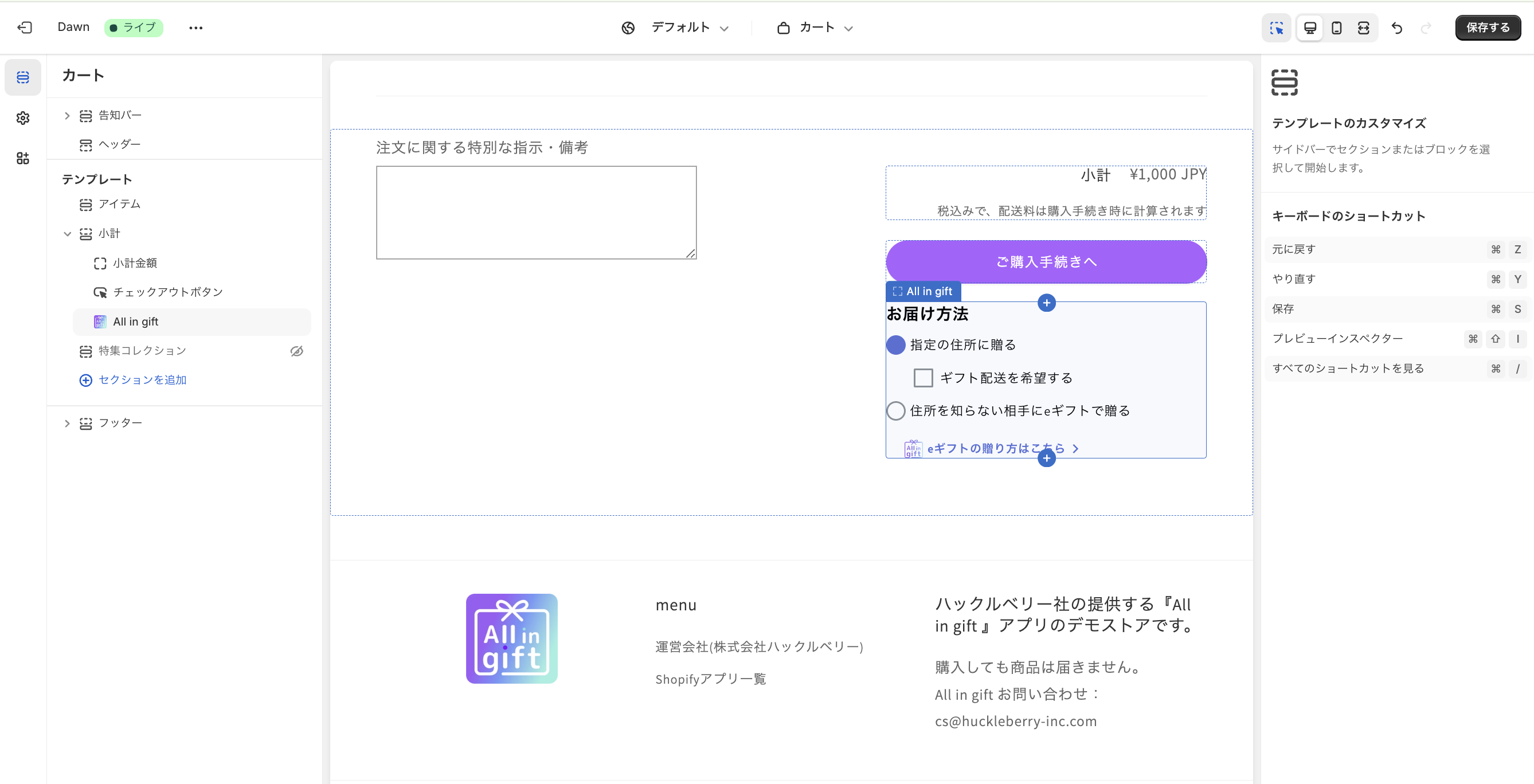 概要 --- OS2.0テーマをご利用の場合、Shopify管理画面のテーマエディタからアプリウィジェットのデザイン編集が可能です。 注意点 - 2022/10/22以降の仕様変更により、テーマエディタで編集可能になりました。 - 過去にCSSでデザイン調整をしていた場合は、そのCSSを削除してください。CSSが優先されて適用されるため、テーマエディタでの編集が反映されないことがあります。 - 以下の「ギフトオプションの項目」および「不要」の文言はアプリの仕様上テキスト変更ができません。 設定方法 --- 1. Shopify管理画面 > オンラインストア > テーマ > カスタマイズに進む 2. 対象ページ(商品ページやカートページなど)を選択する 3. All in giftブロックをクリック 4. 編集内容を設定 5. 保存をクリックして完了です (赤丸=購入画面、青丸=テーマエディタ画面 編集対象 テキスト初期値 設定可能内容 1. チェックアウトボタンのテキスト ー テキスト編集・各ボタンカラー編集 2. マルチシップ用のギフト設定ボタンのテキスト ギフト設定 テキスト編集