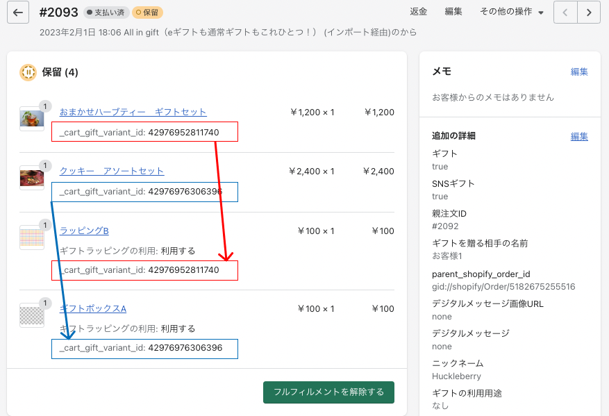 複数の商品に個別のギフトオプションを設定して購入された場合、どの商品にどのギフトが紐づいたかは注文情報の properties で確認できます。