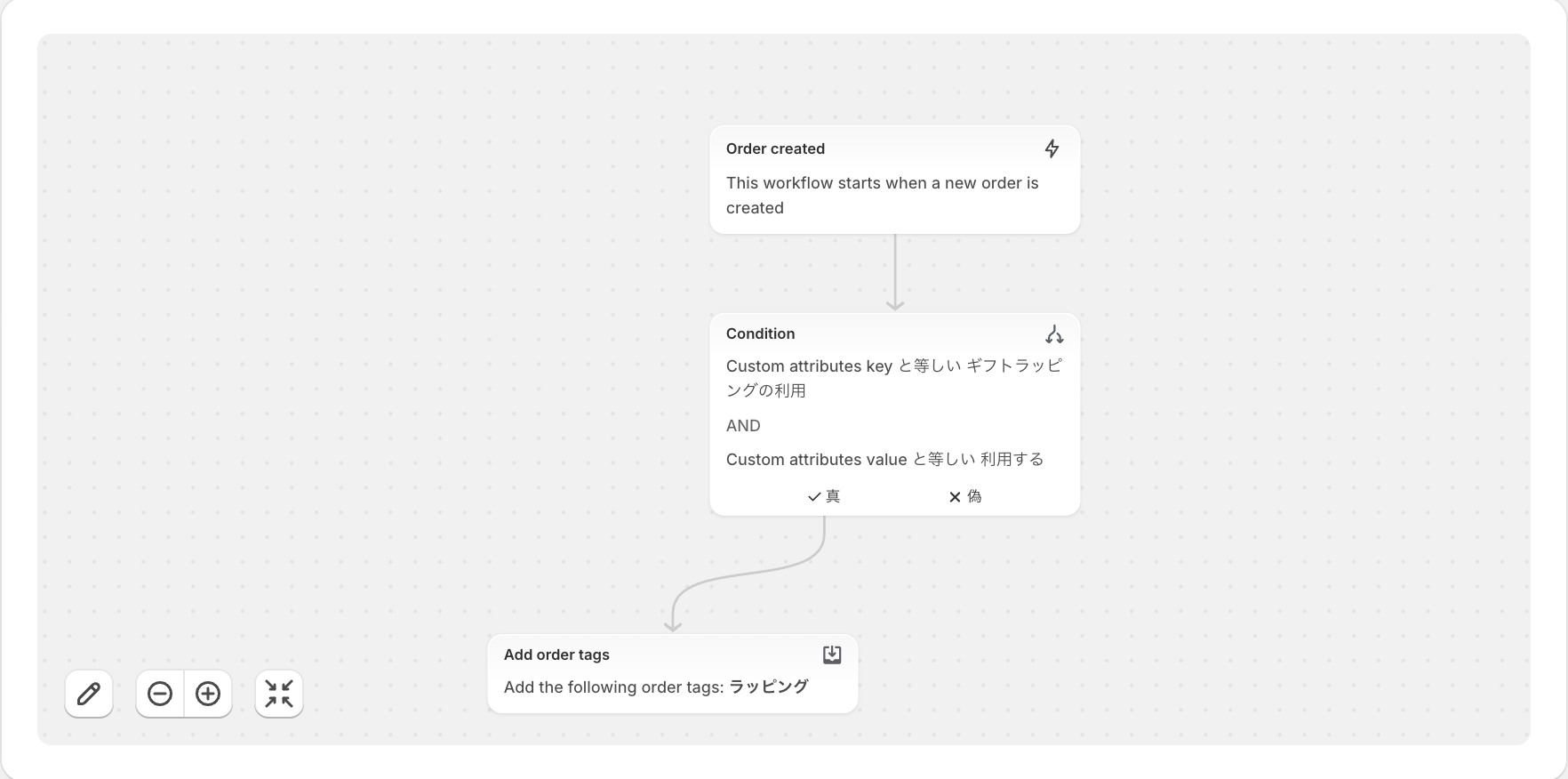 アクション | Add order tags: ラッピング | 条件が一致する場合に、「ラッピング」のタグを注文に付与します |