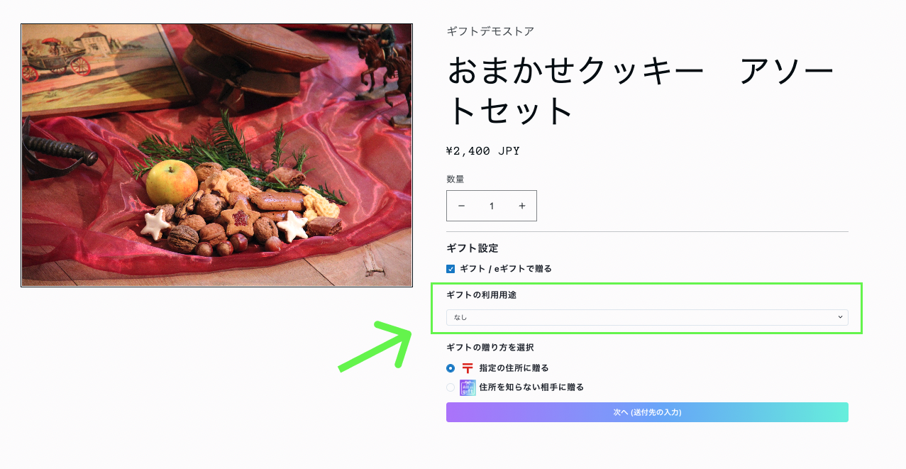 購入の際に「ギフトの利用用途」プルダウンが表示されます。