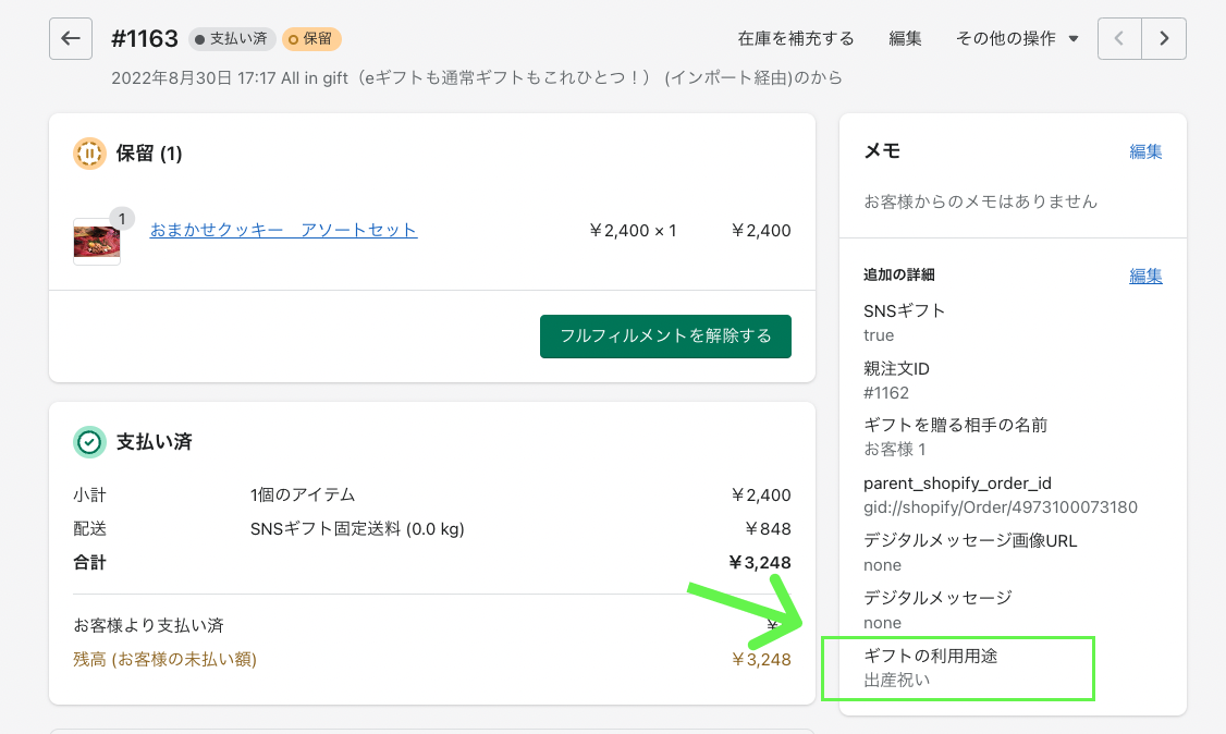選択されたギフト用途は、注文情報のNote Attributeに出力されます。