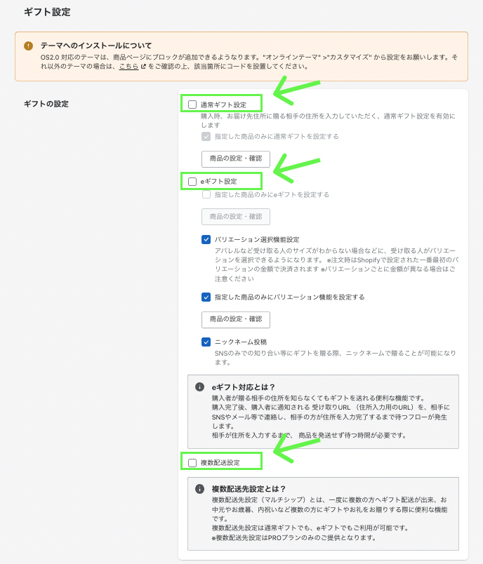 アプリ管理画面の ギフト設定 > ギフトの設定 で 「通常ギフト設定」「eギフト設定」「複数配送設定」のうち非表示にしたいもののチェックを外し、ページ下部の「保存」をクリック