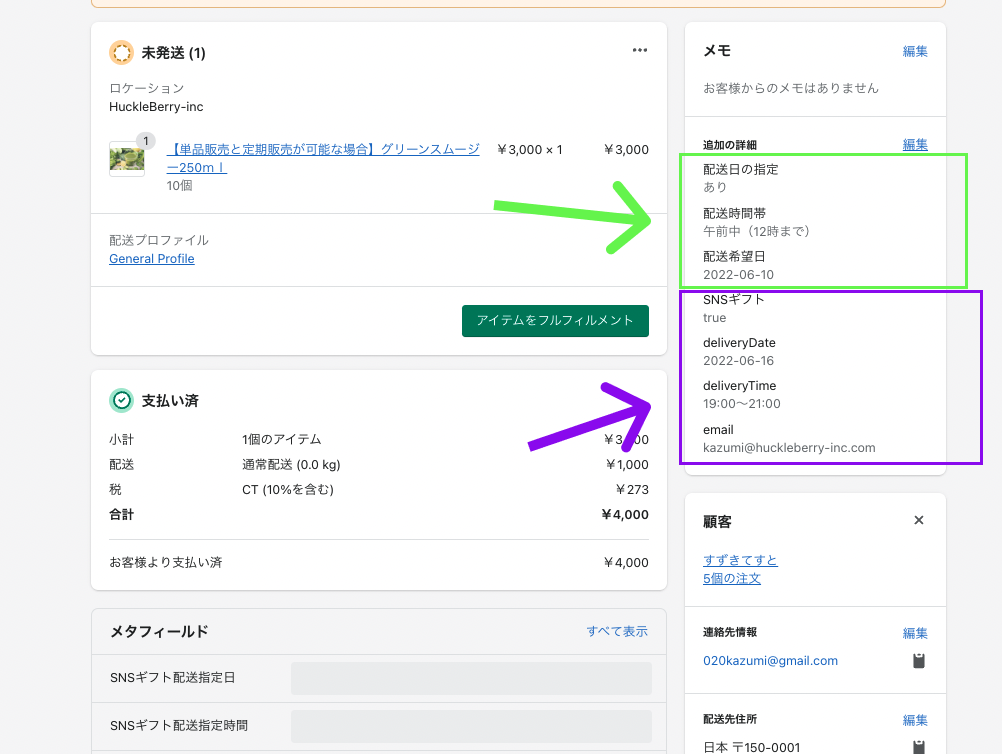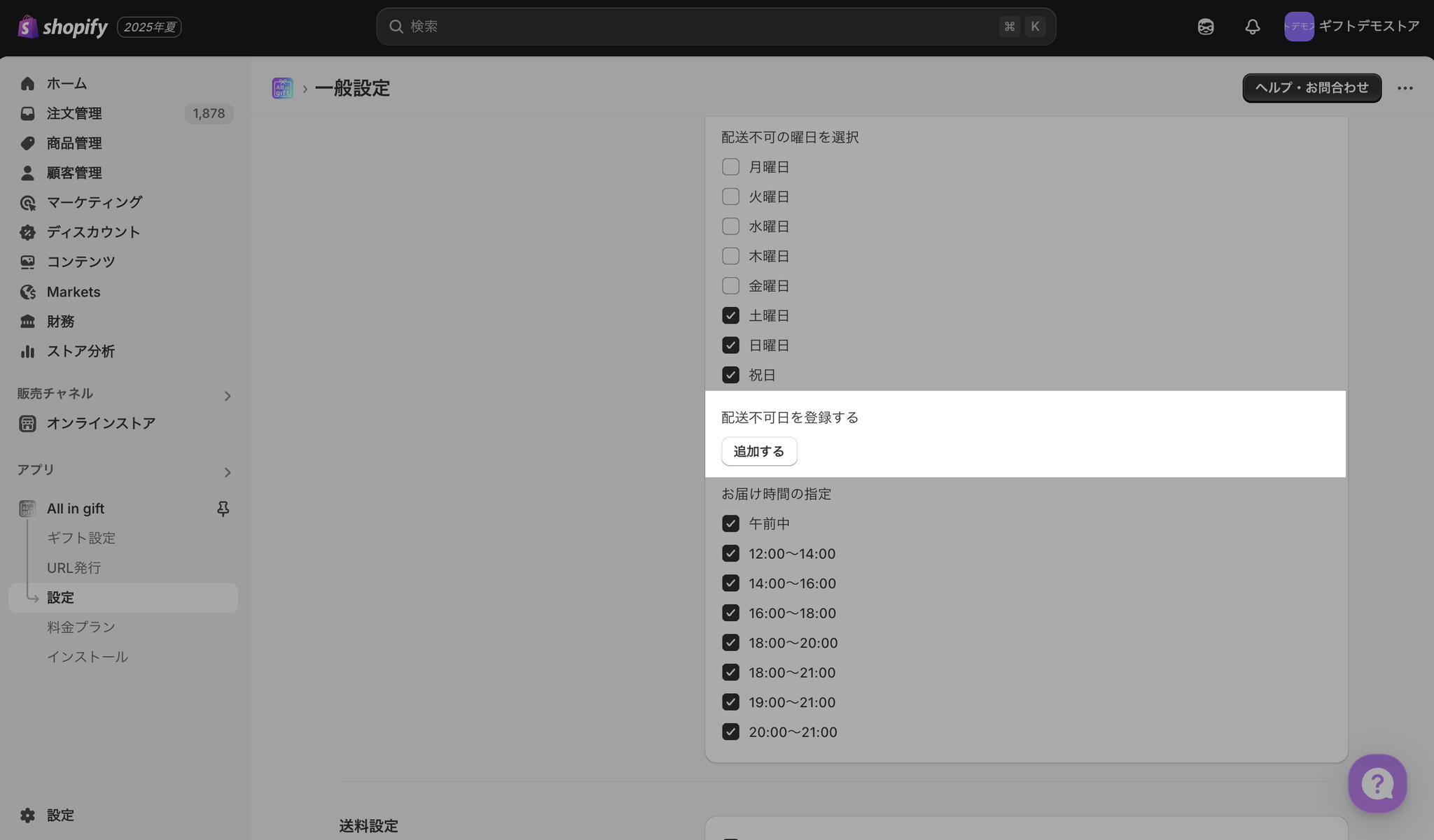 設定方法 --- 1. アプリ > All in gift >「配送設定」 に進む 2. 自社配送を選択 3. 受取者が入力した、配送日時指定情報の出力先を設定する - メタフィールドに出力を選択した場合:表示例 - Note Attributesに出力を選択した場合 - 出力するパラメータを任意のものに変更出来ます。 - Note attributesは、注文情報を出力した際、カラムとして出力できます。 - 注文管理タグに出力 に出力を選択した場合:表示例 お届け先の住所が未入力時にタグを付与する --- お届け先の住所が未入力時にタグを付与することが可能です。 1. アプリ > All in gift > 配送設定 > お届け先の住所が未入力時にタグを付与する に進む 2. 付与する にチェックを入れる 3. 任意の注文タグ名を入力 4. 保存をクリックして完了です。