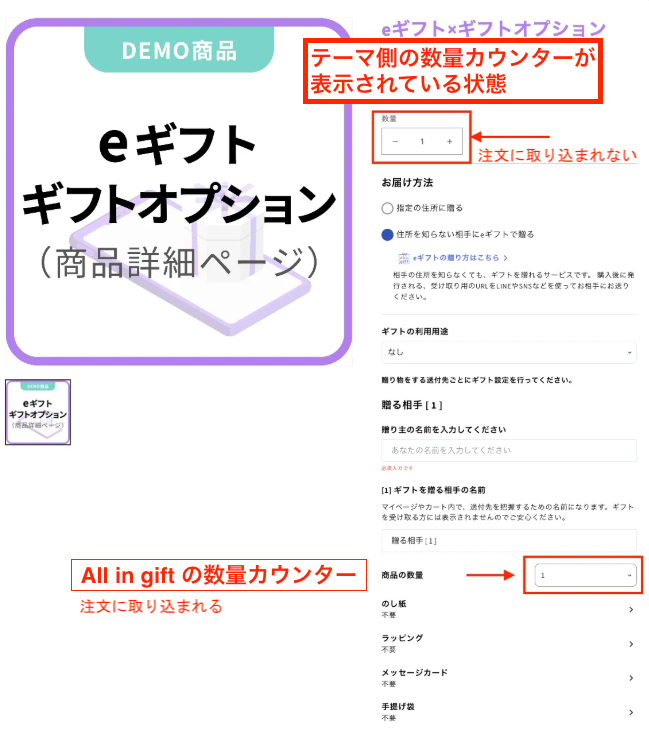 そのためユーザーがギフト設定をする際、テーマ側の数量カウンターやメモ欄を非表示にする必要があります。