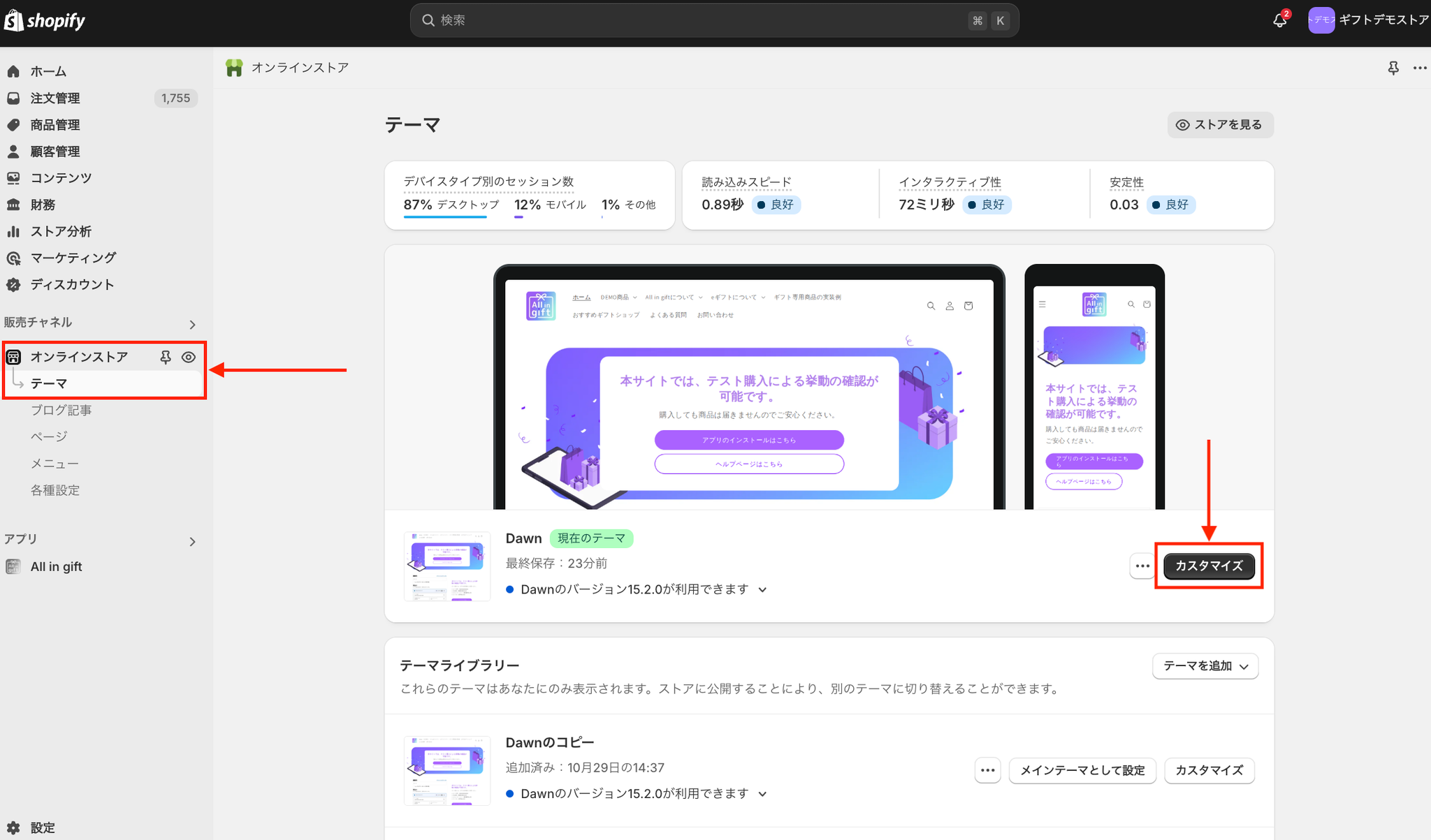 オンラインストア>テーマ>カスタマイズをクリック