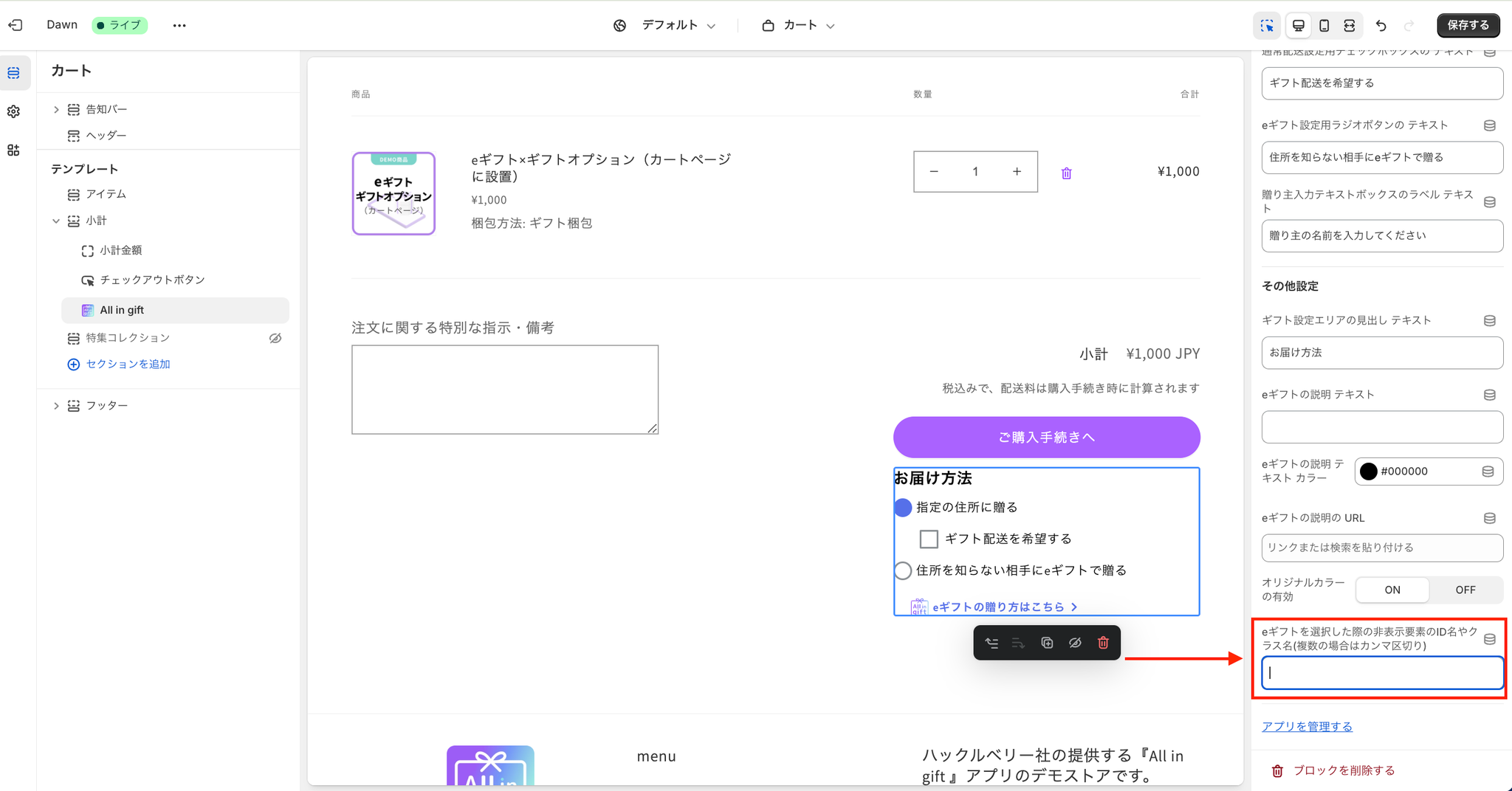 アプリ編集画面の一番下にある「eギフト選択時に非表示にする要素のIDやクラス名(複数可、カンマ区切り)」に、1で確認したクラス名やID名を入力