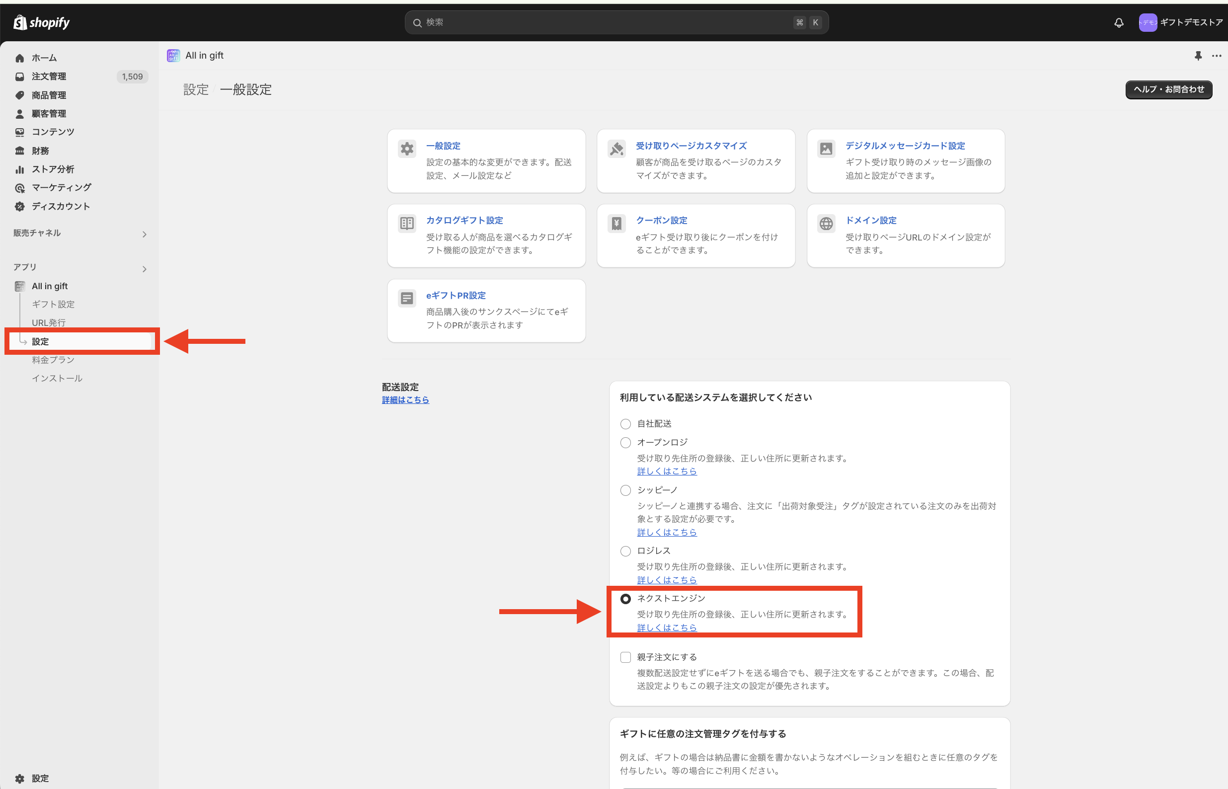 1. アプリ > All in gift > 設定 > 配送設定 に進む