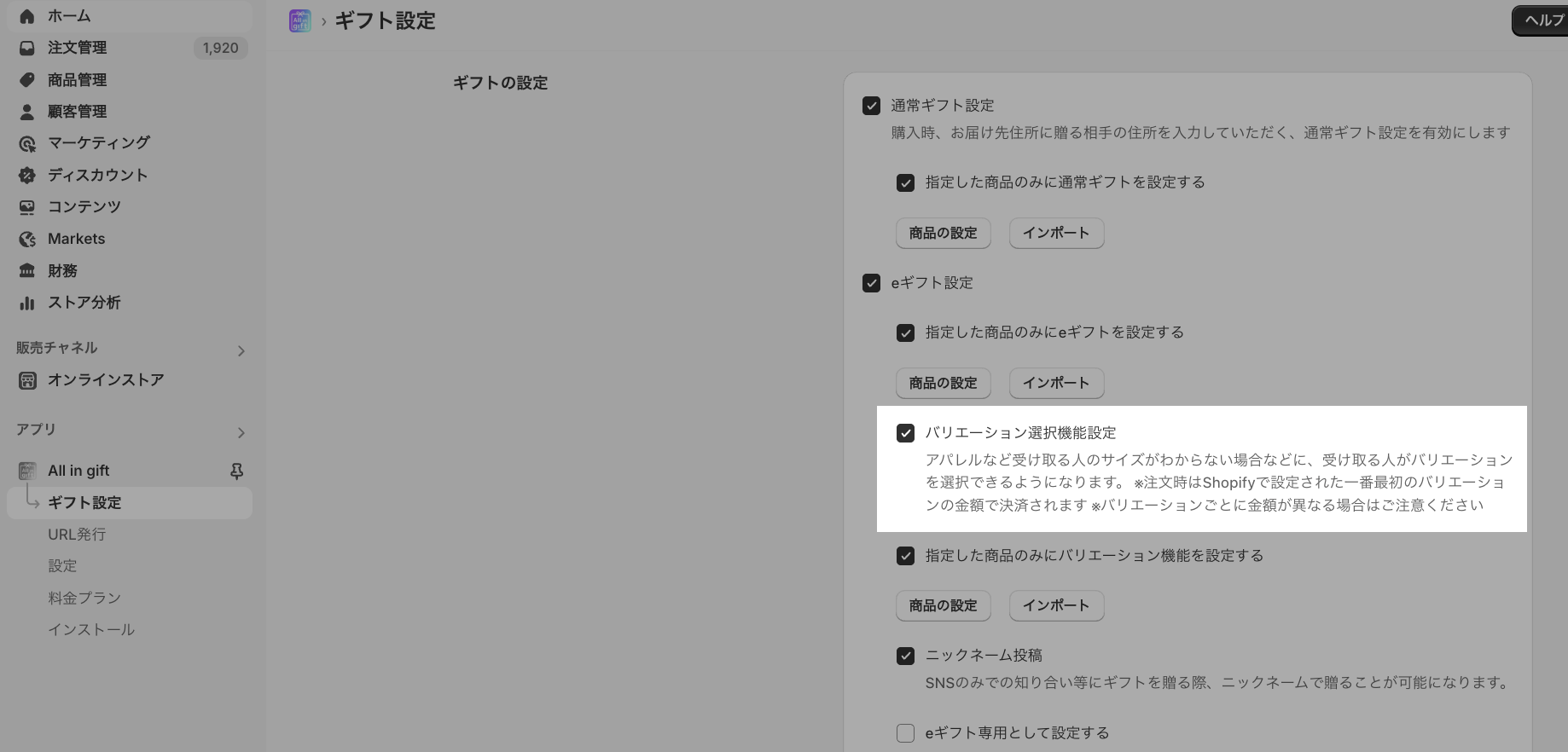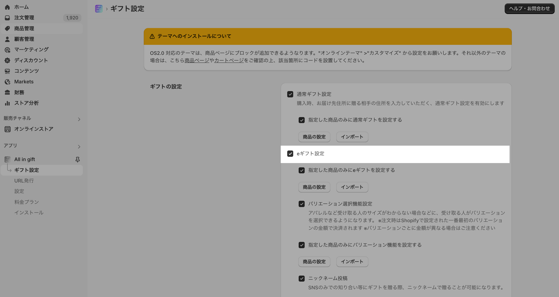アプリ > All in gift > ギフト設定 > eギフト設定にチェックをいれる