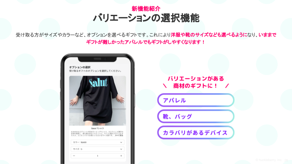 バリエーション選択機能(単体) | 単一商品のギフトで、受け取り者がサイズ・色を選択可能 |
