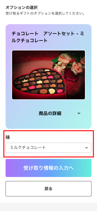 カタログギフトに登録された商品でバリエーション機能を有効にしている場合、受け取り者はサイズやカラーを選択可能です。