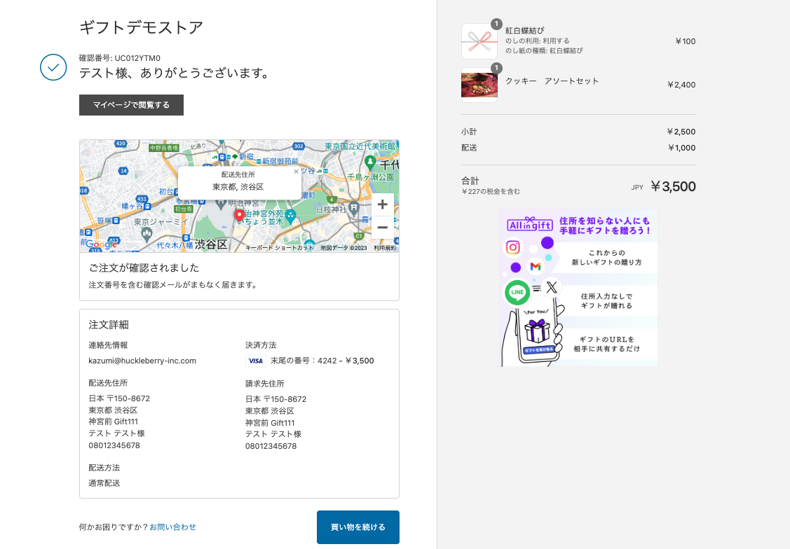 All in gift では、以下2つの設定によって、購入者マイページおよび確認メールで表示される配送先情報が変わります。