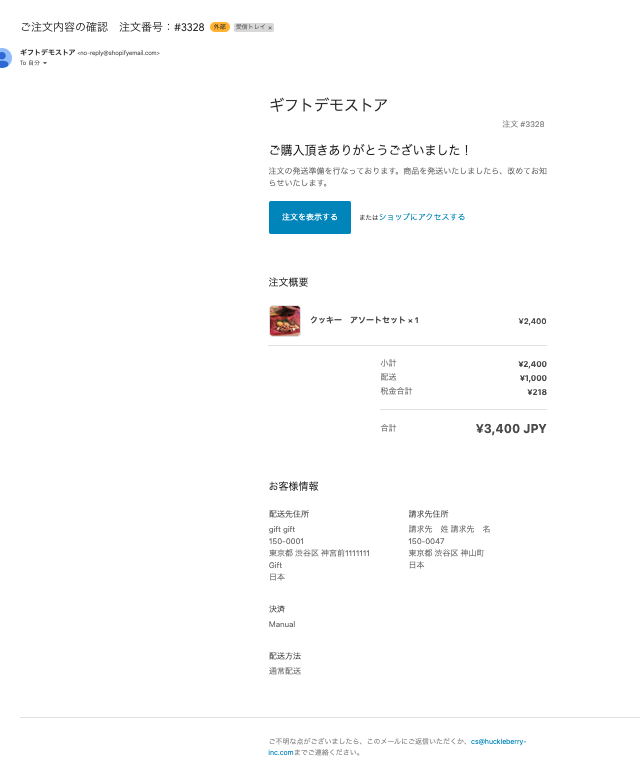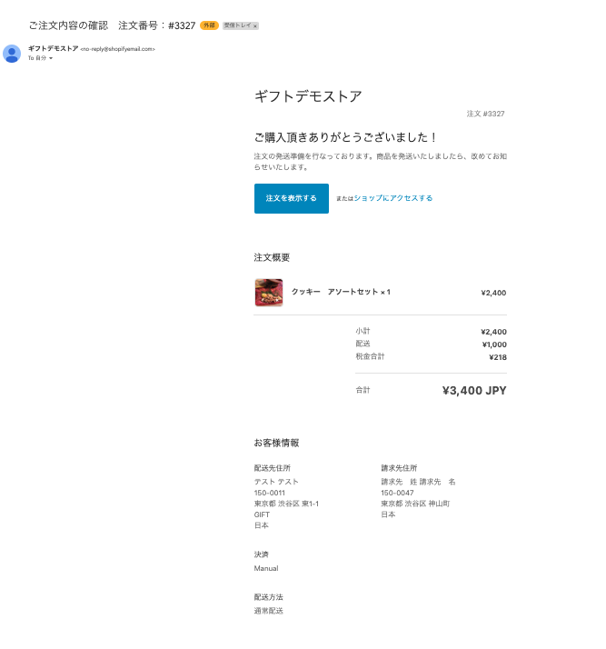 注文確認メール :購入者に1通送信され、配送先住所が記載されます。