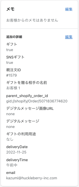 ご利用頂く機能、設定に応じて注文情報のNoteAttributesに、アプリから情報が付与されます。付与される情報は以下となります。