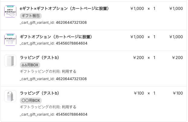 _cart_gift_variant_id:{XXXXXXX}_cart_gift_variant_idは、商品のバリアントIDが入るようになっています。ギフトオプションの_cart_gift_variant_idは、紐づく商品のidと同じ値が入るようになっています。