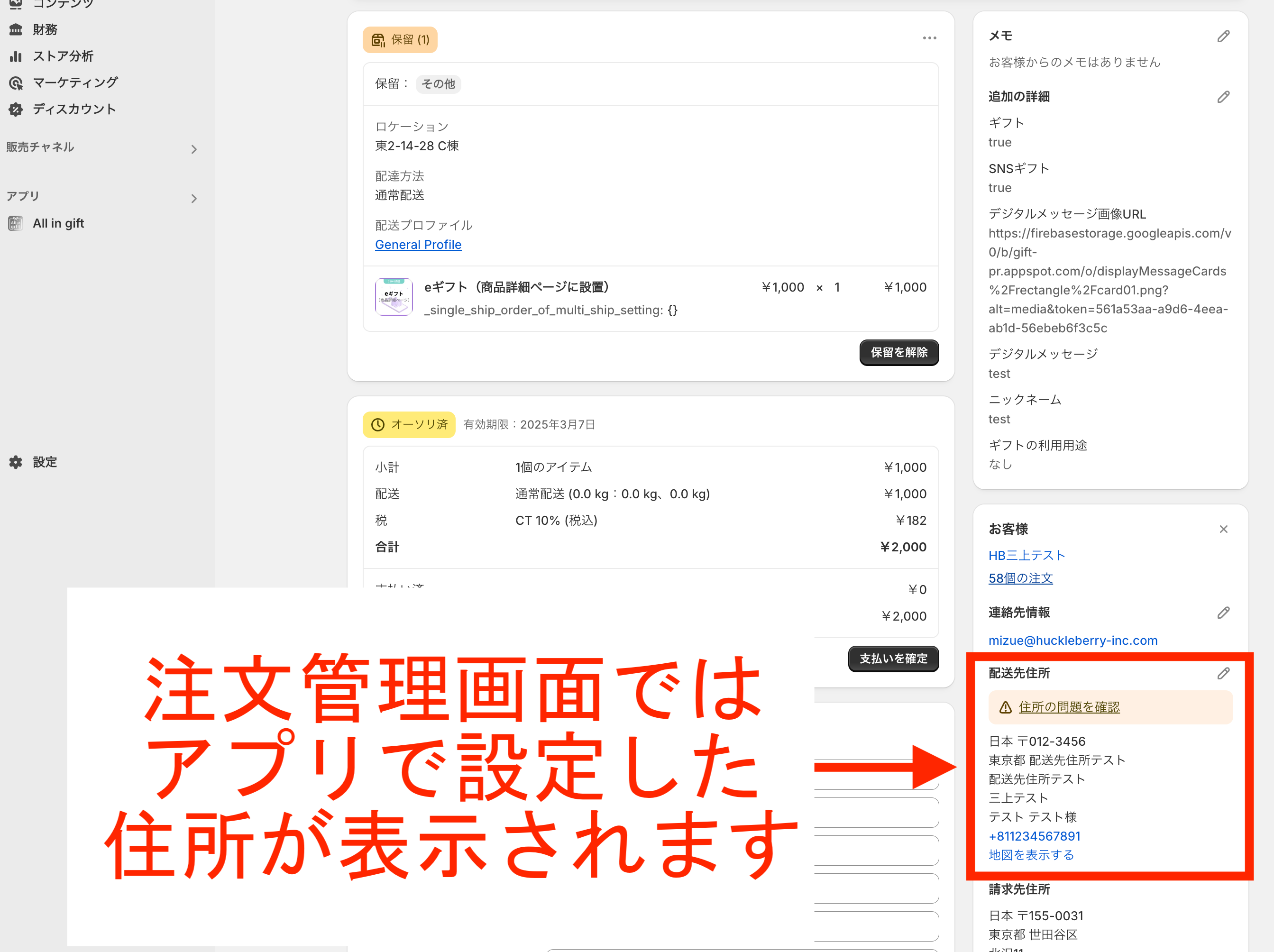 こちらで編集した「仮配送情報」は、eギフト注文時に受け取り者が配送先を入力するまでの間「注文情報の配送先住所」に反映されます。