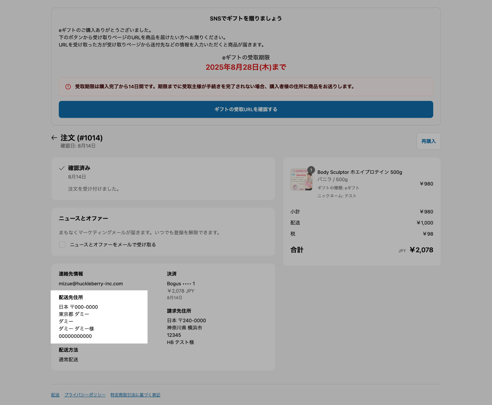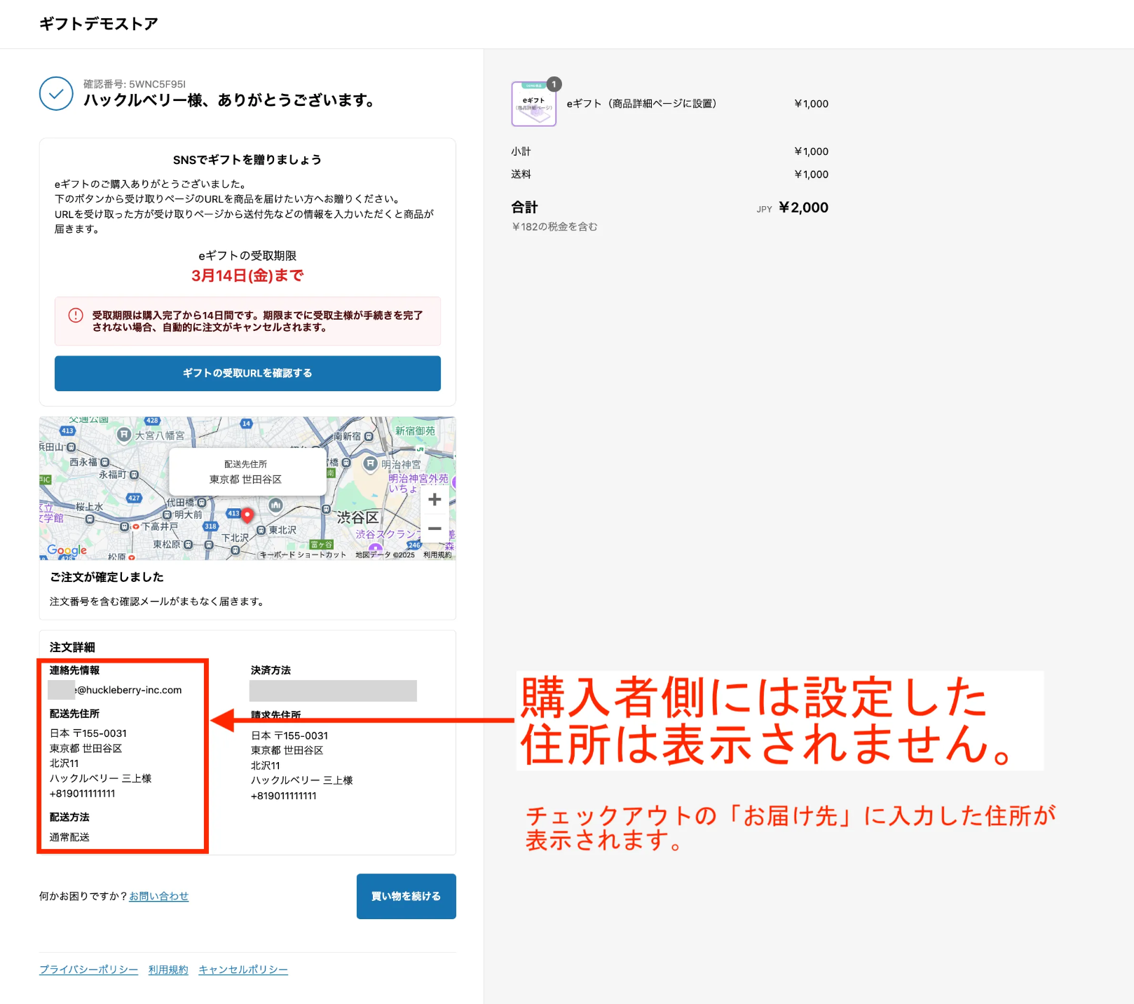 配送先住所入力をスキップしない場合、eギフト購入時点でのWMSへの住所連携を防ぐため、ダミー住所が取り込まれる仕様です。