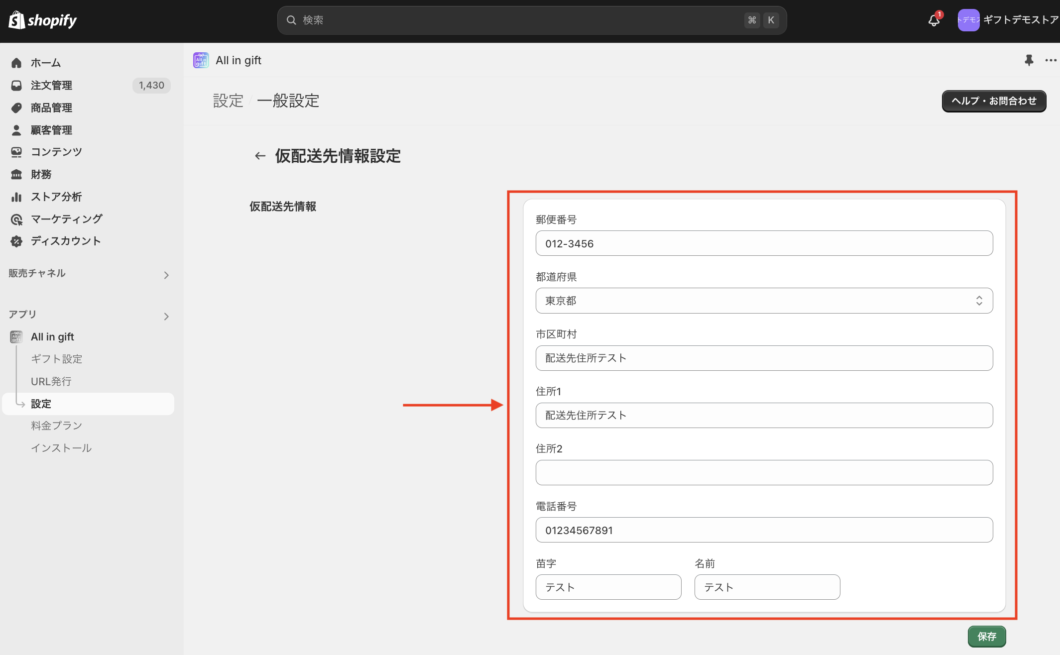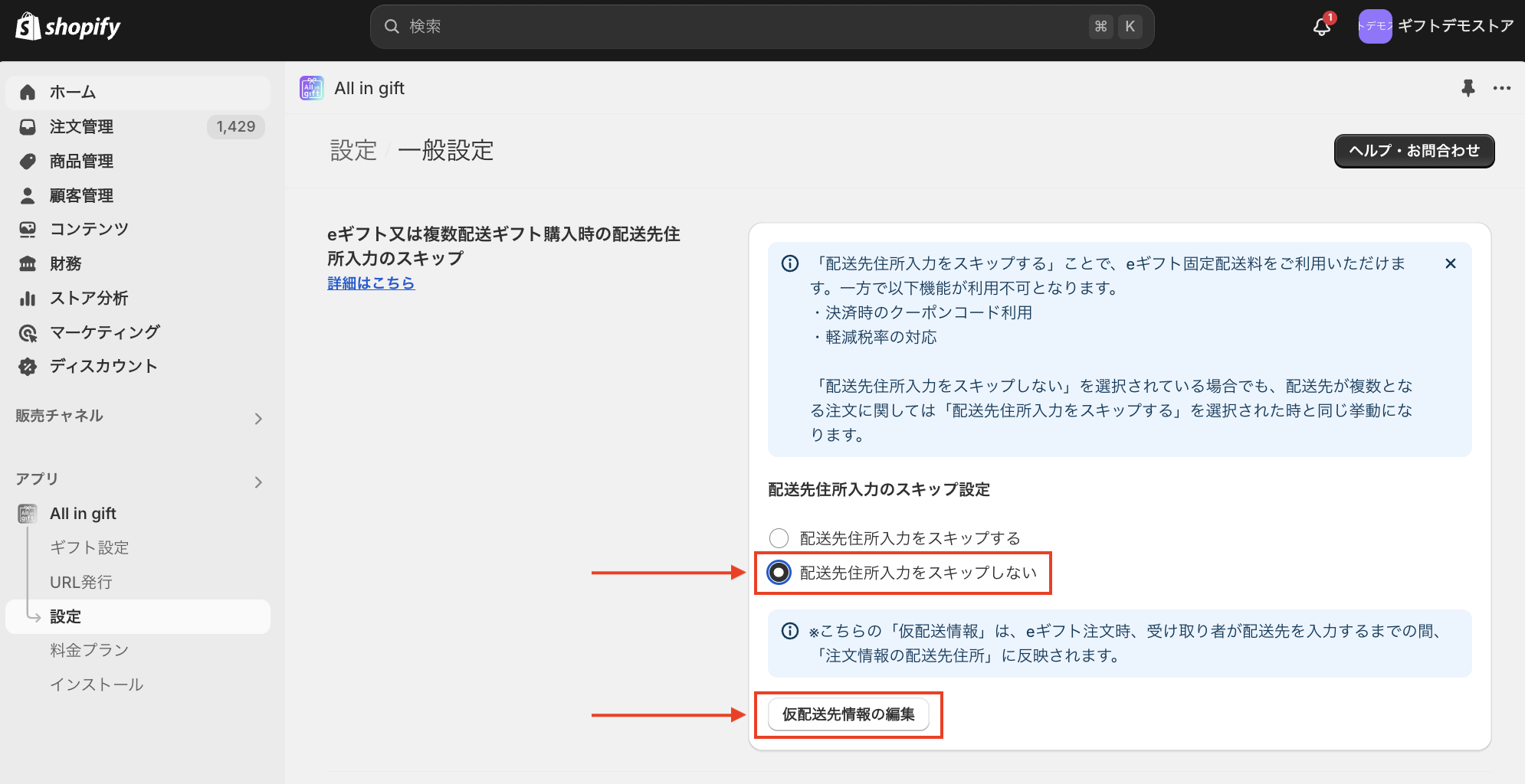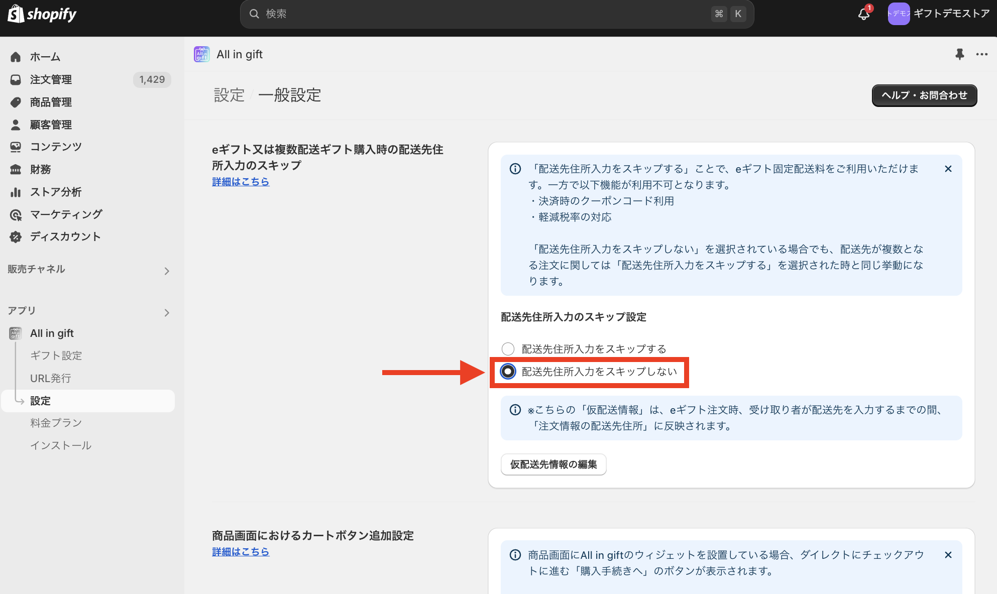 アプリ > All in gift > 設定 > 一般設定 > eギフト又は複数配送ギフト購入時の配送先住所入力のスキップ >