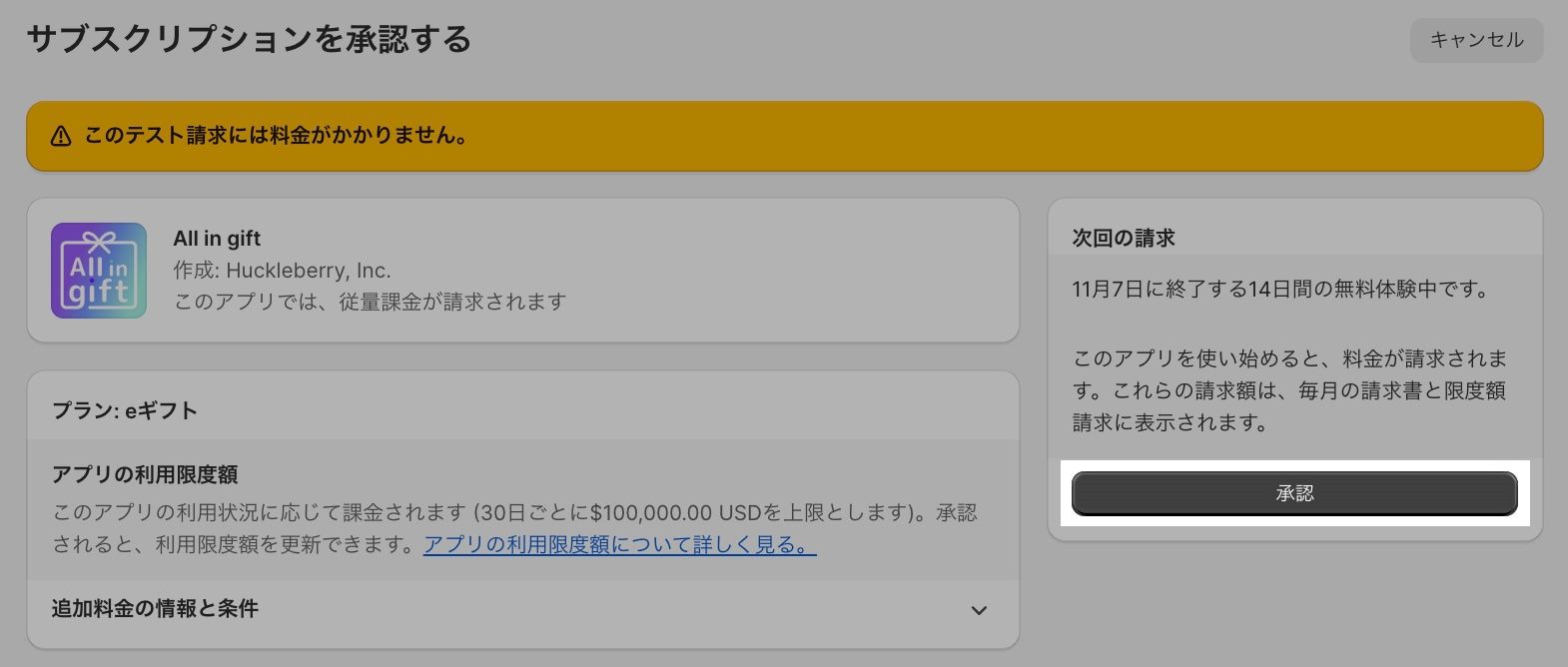 アプリのインストール時に表示される「30日ごとに$100,000.00 USDを上限とします」というメッセージは、Shopifyの請求上限を示しています。