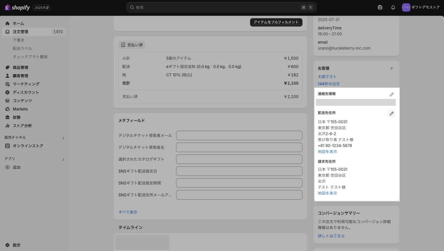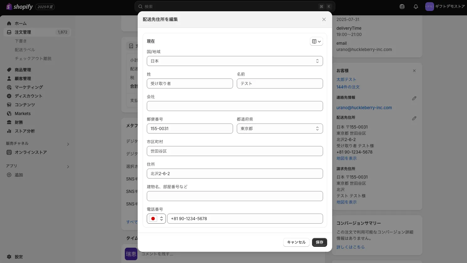はい、Shopifyの管理画面から編集が可能です。受け取り者が誤って入力した内容(氏名・住所など)は、以下の手順で修正してください。Shopify管理画面 > 注文管理 > 該当注文の詳細画面に進む連絡先情報、配送先住所の編集ボタンをクリック編集する保存をクリックして完了です。