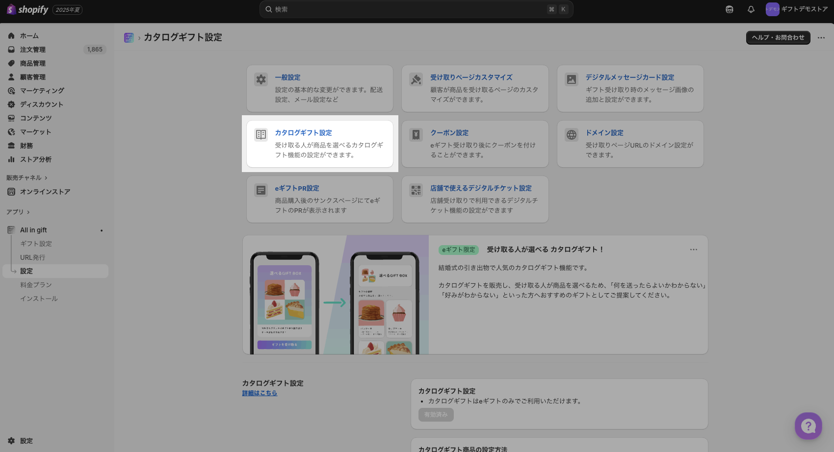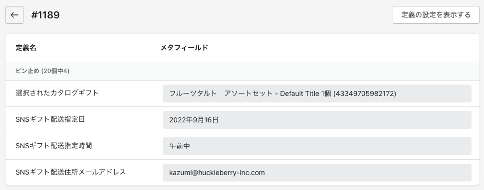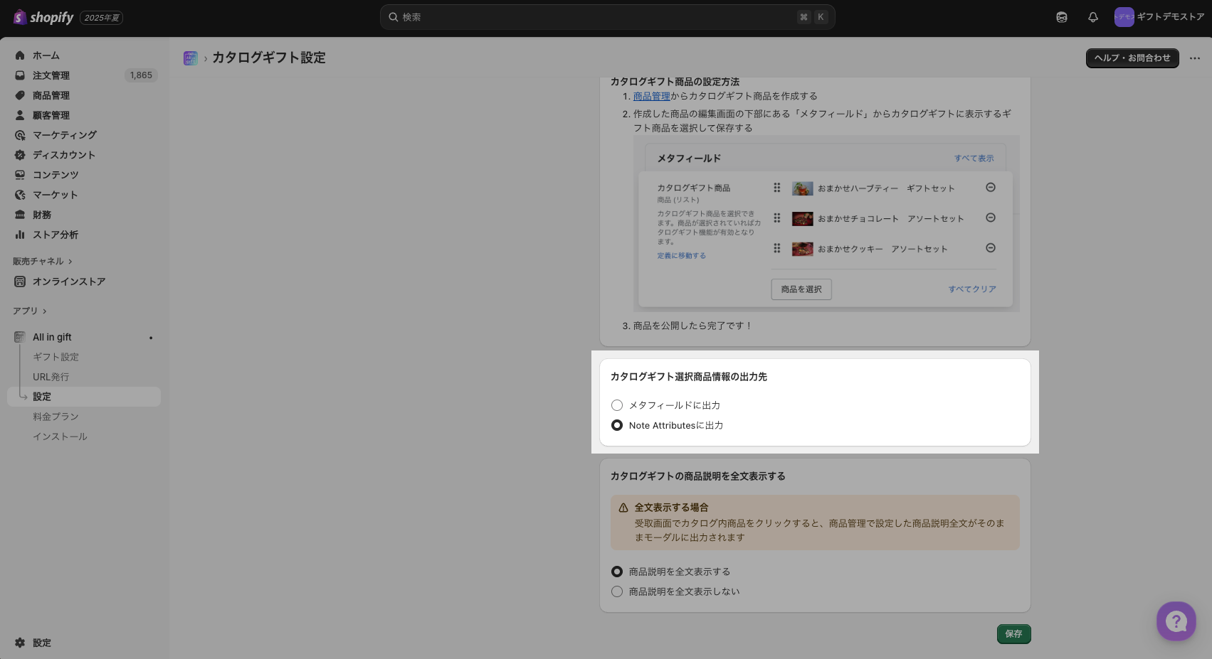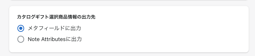 カタログギフトで受取者が選択した商品情報は、出力先を「メタフィールド」または「Note Attributes」から選択できます。設定はアプリ管理画面から行います。