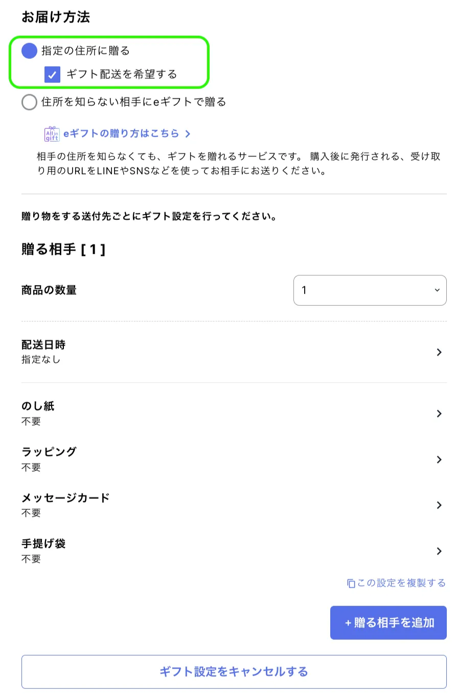この機能は、購入ページにおいて「ギフト配送を希望する」がデフォルトで選択された状態になります。