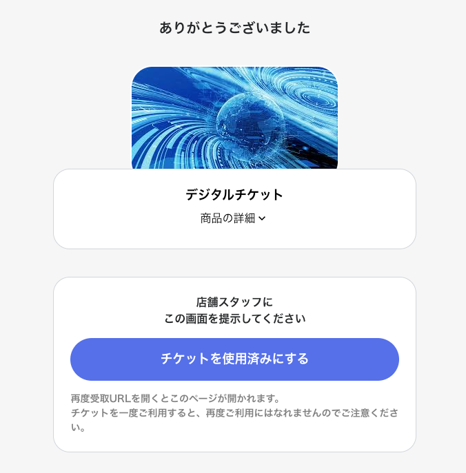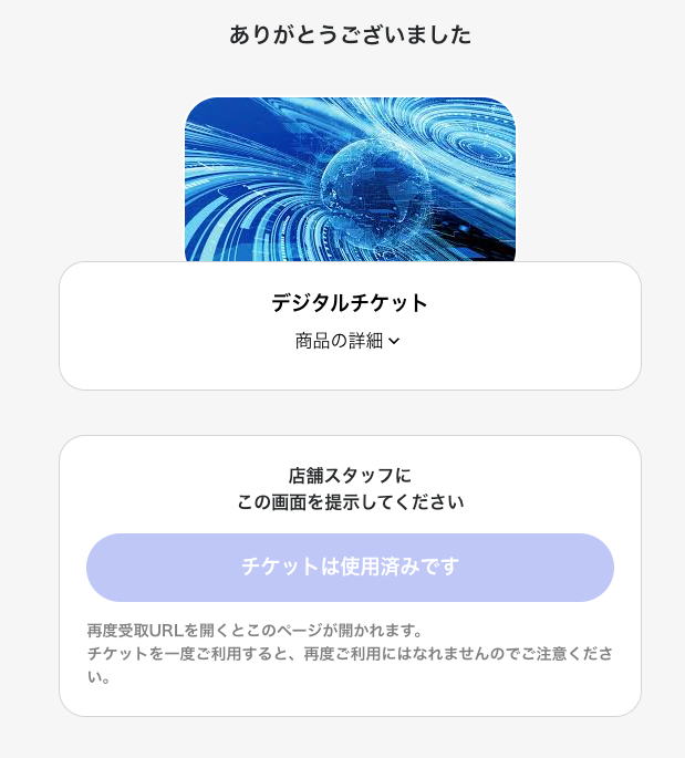 受け取り完了ページに、店舗で利用できるデジタルチケットが表示されます。