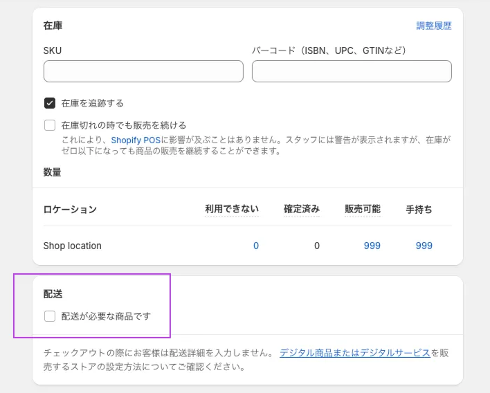 「配送が必要な商品です」のチェックを外し、配送不要商品として登録する