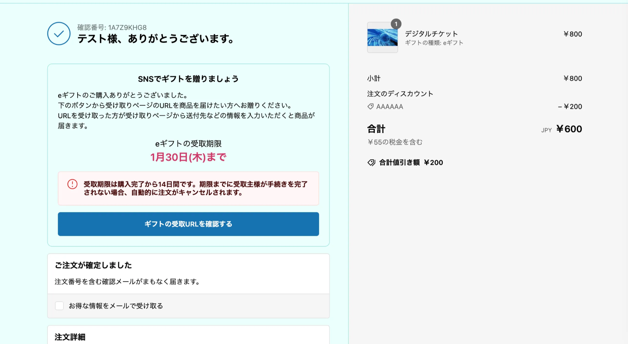 購入完了後、サンクスページに「ギフト受取URL」が表示されます。