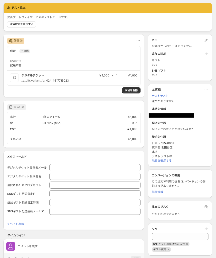 保留注文が作成されます。Note Attributes やタグに指定のデータが保存されます。