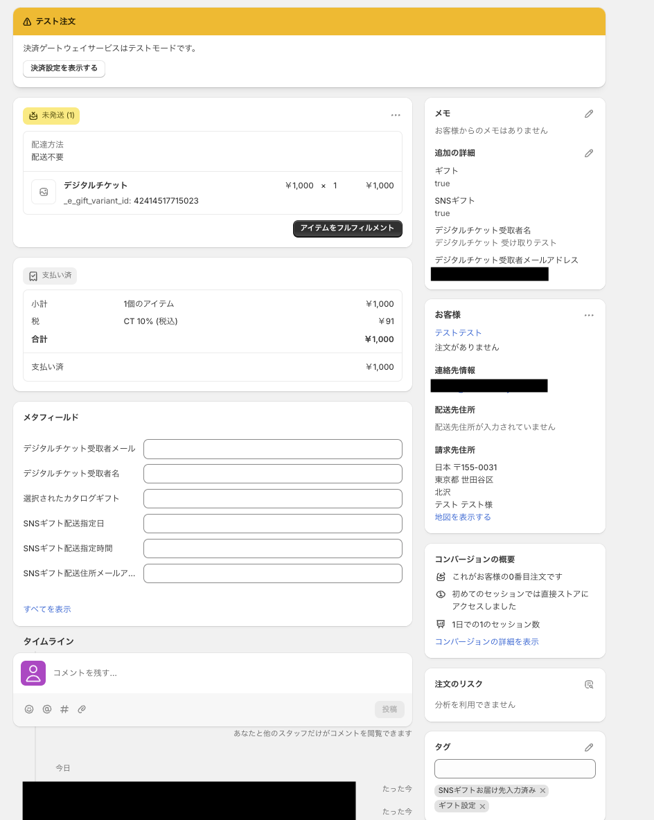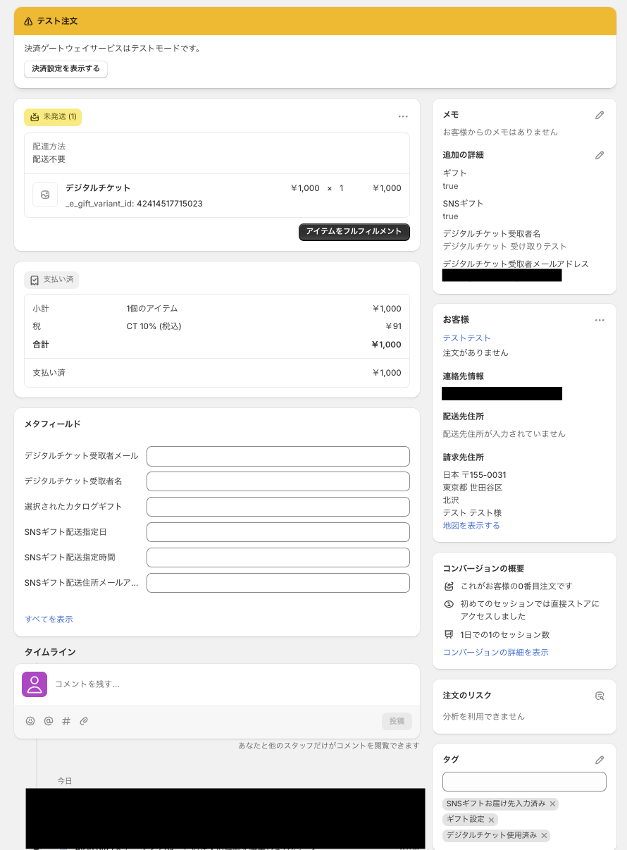 未発送に更新されます。Note Attributes を選択している場合、Shopify注文詳細の「追加の詳細」に表示されます。