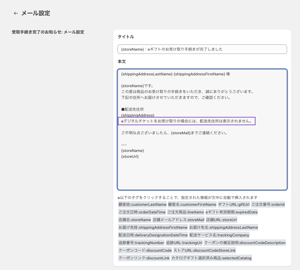 アプリから送付される受取完了メール:住所欄は空欄のため、メール本文のカスタマイズを推奨します。